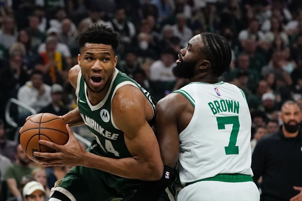 5月13日,雄鹿队球员安特托昆博(左)在2021-2022赛季NBA季后赛东部半决赛第六场比赛中遭遇凯尔特人队球员布朗犯规。新华社/美联
