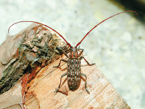 ▲ 松材线虫病自然传播借助松褐天牛和云杉花墨天牛等媒介昆虫的活动完成 图为松褐天牛成虫