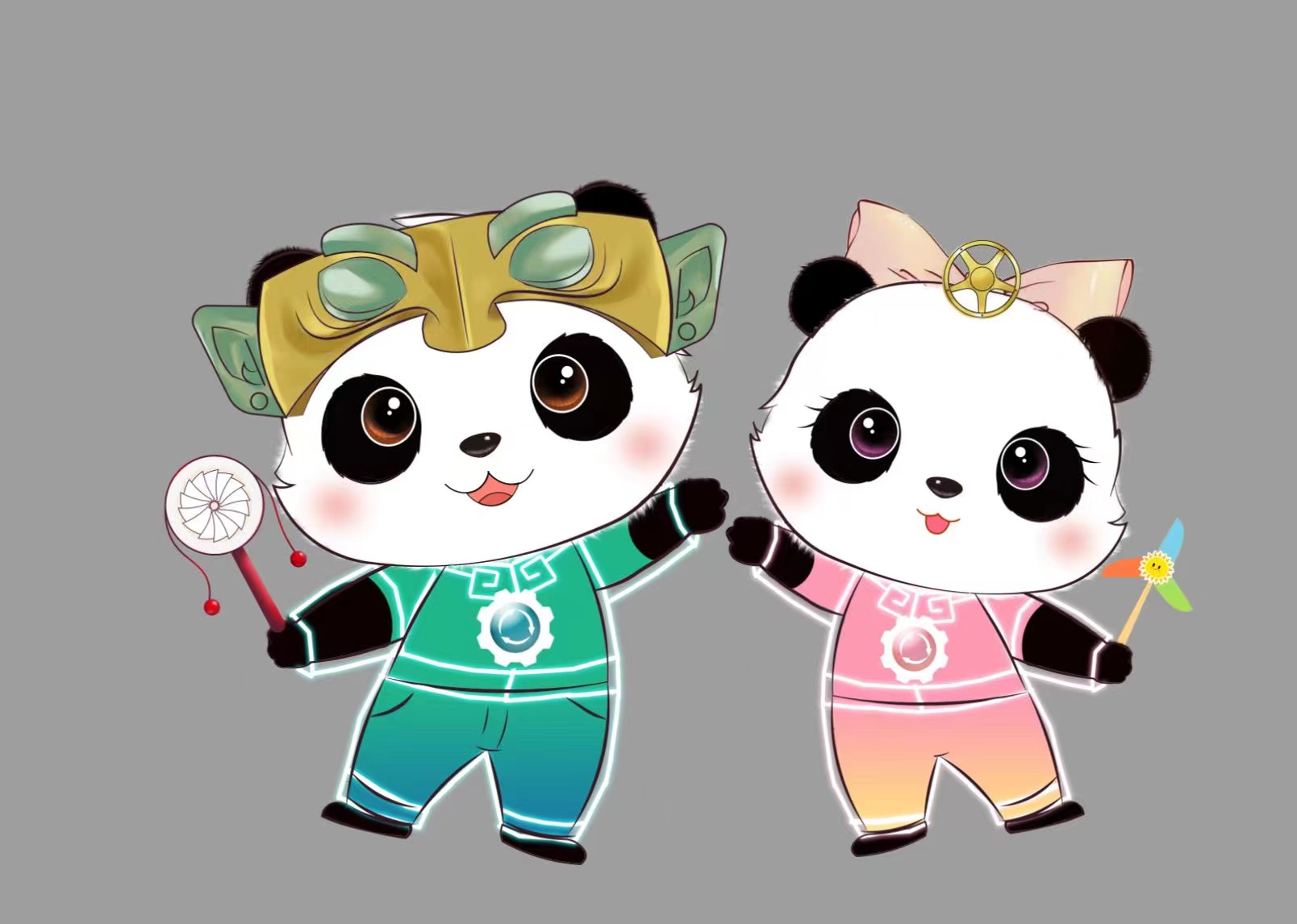 吉祥物中,“清清”头戴三星堆面具样式的头箍,手拿拨浪鼓,鼓面图案为水轮机核心部件“转子”。“源源”则是头戴太阳轮图案的发夹,手拿风车,是风轮发电的象征。它们胸前的“齿轮”图案,代表智能制造与绿色能源的表达。