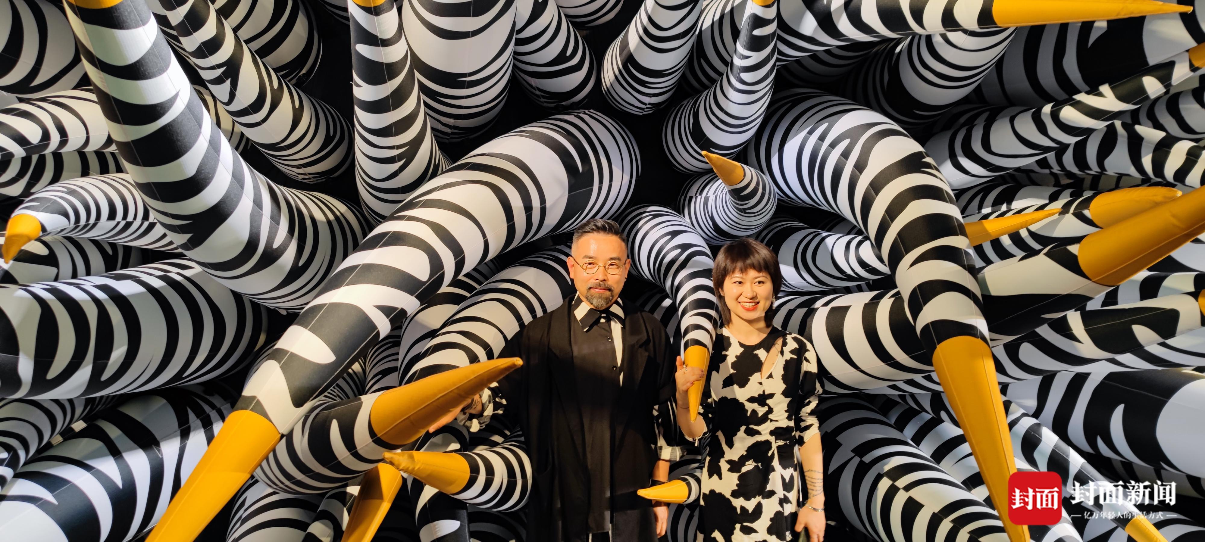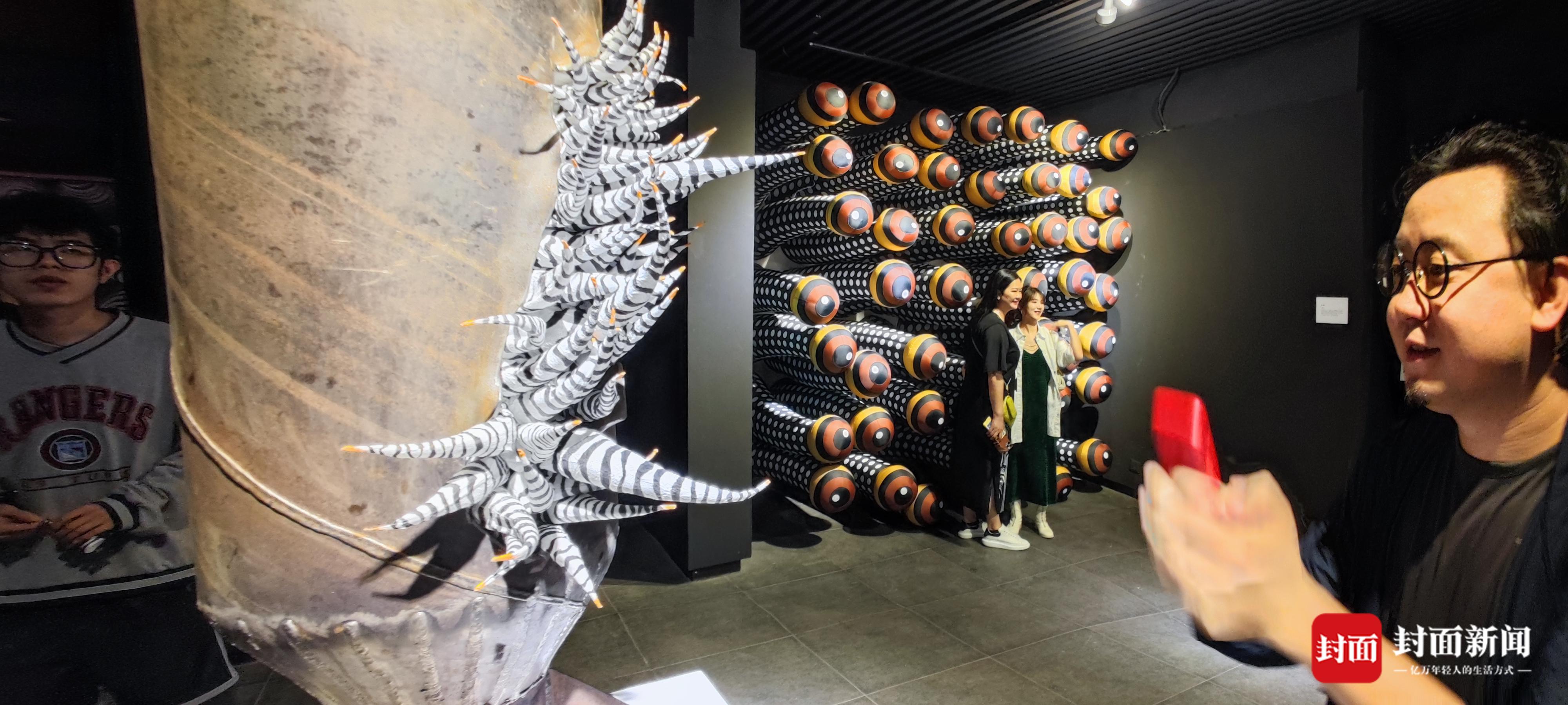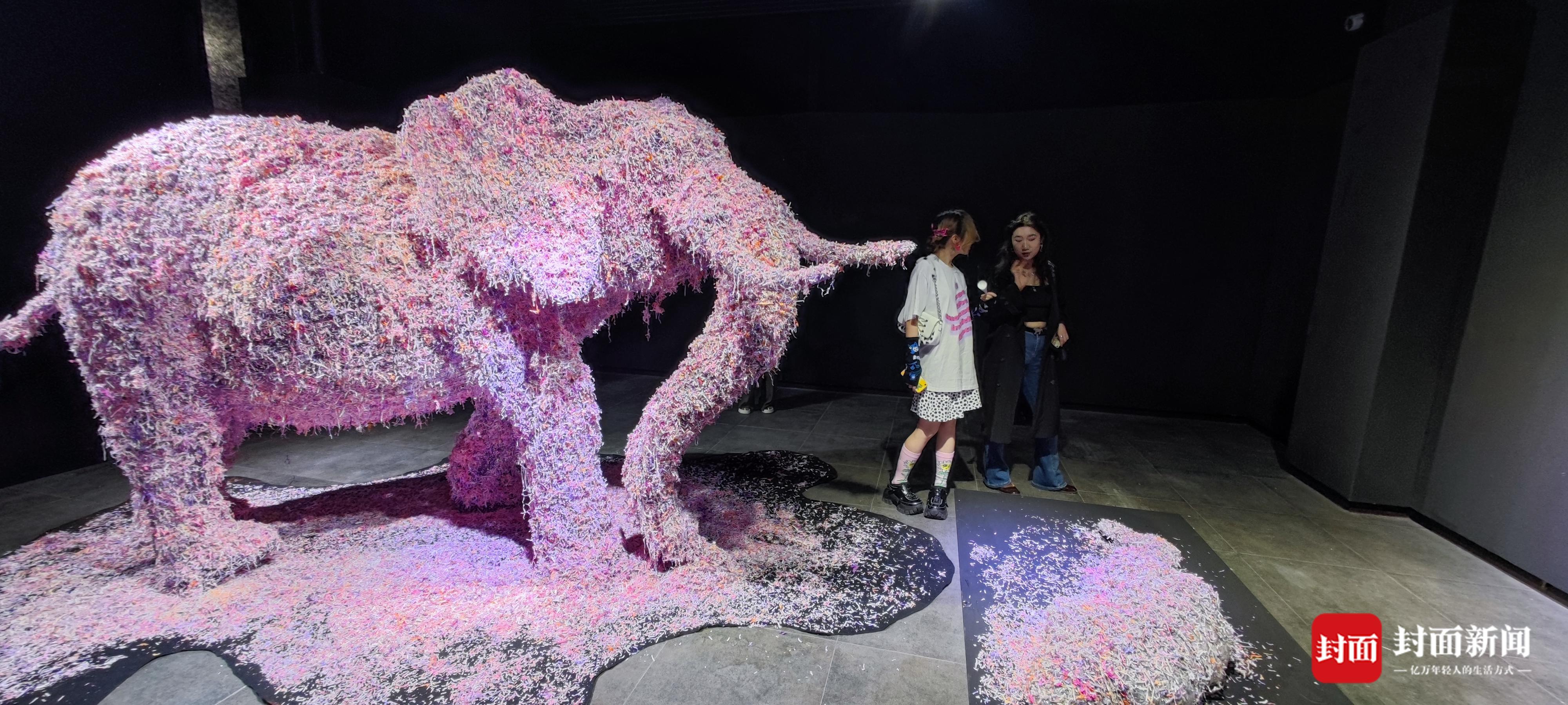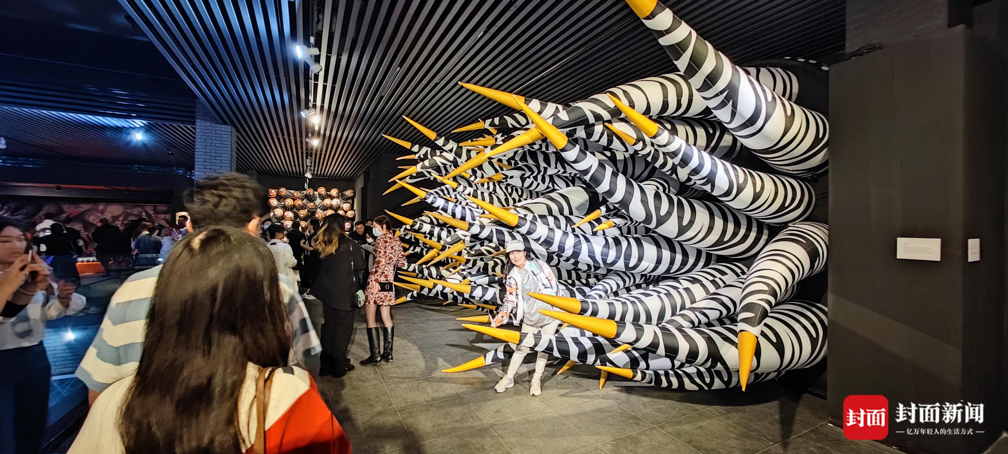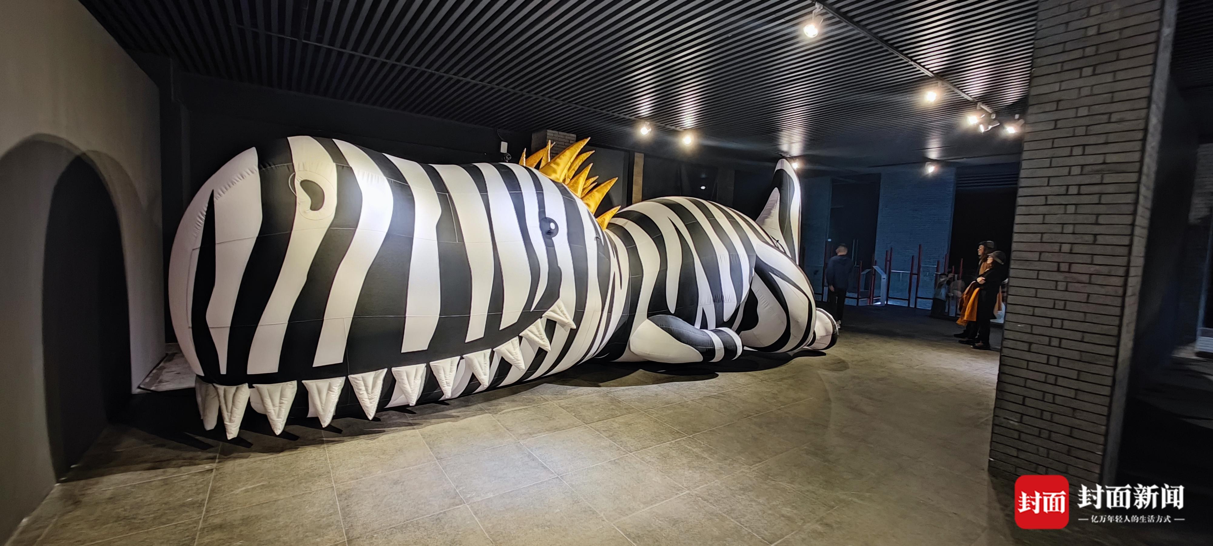 而另一位艺术家施扬也用自己独特的创作手法给观众带来一个生动的“异想世界”。一只比“粉丝”大象更巨大的生物静卧在展厅C位,这个生物好似斑马,因为它身上那标志性的黑白条纹。施扬告诉封面新闻记者,这件作品的灵感的确来自斑马。“斑马是非洲草原很有代表性的动物,它身上的黑白纹是一种保护色,这让斑马看上去很强大。”施扬还说,自己的作品和罗鸣的作品风格差异虽然很大,但有一点是共通的,这就是他们的创作都在展示生命的价值。