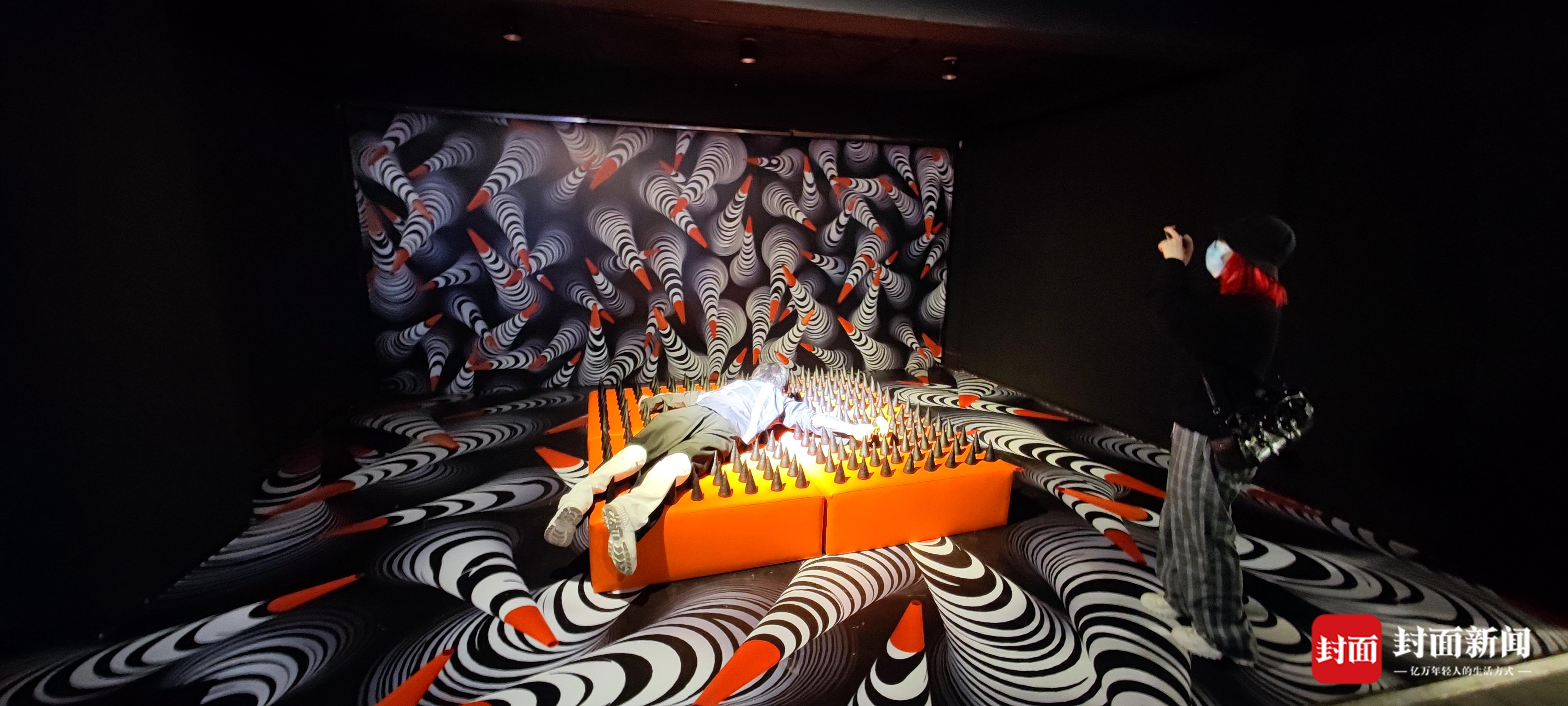 最好玩以及互动性最强的作品是施扬创作的“荆棘沙发”,硕大的沙发上布满看上去锐利的尖刺,但手一摸才发现是柔软的气模材质,发现对自己无害后,大家嘻嘻哈哈地或躺或坐在这个古怪的沙发上拍照留念。就像崔付利所说的那样,“这次展览观众可以沉浸式地进入艺术家创造的艺术世界中,去寻找自我在未来的生活态度和方式,寻找属于自身的定位和坐标。”