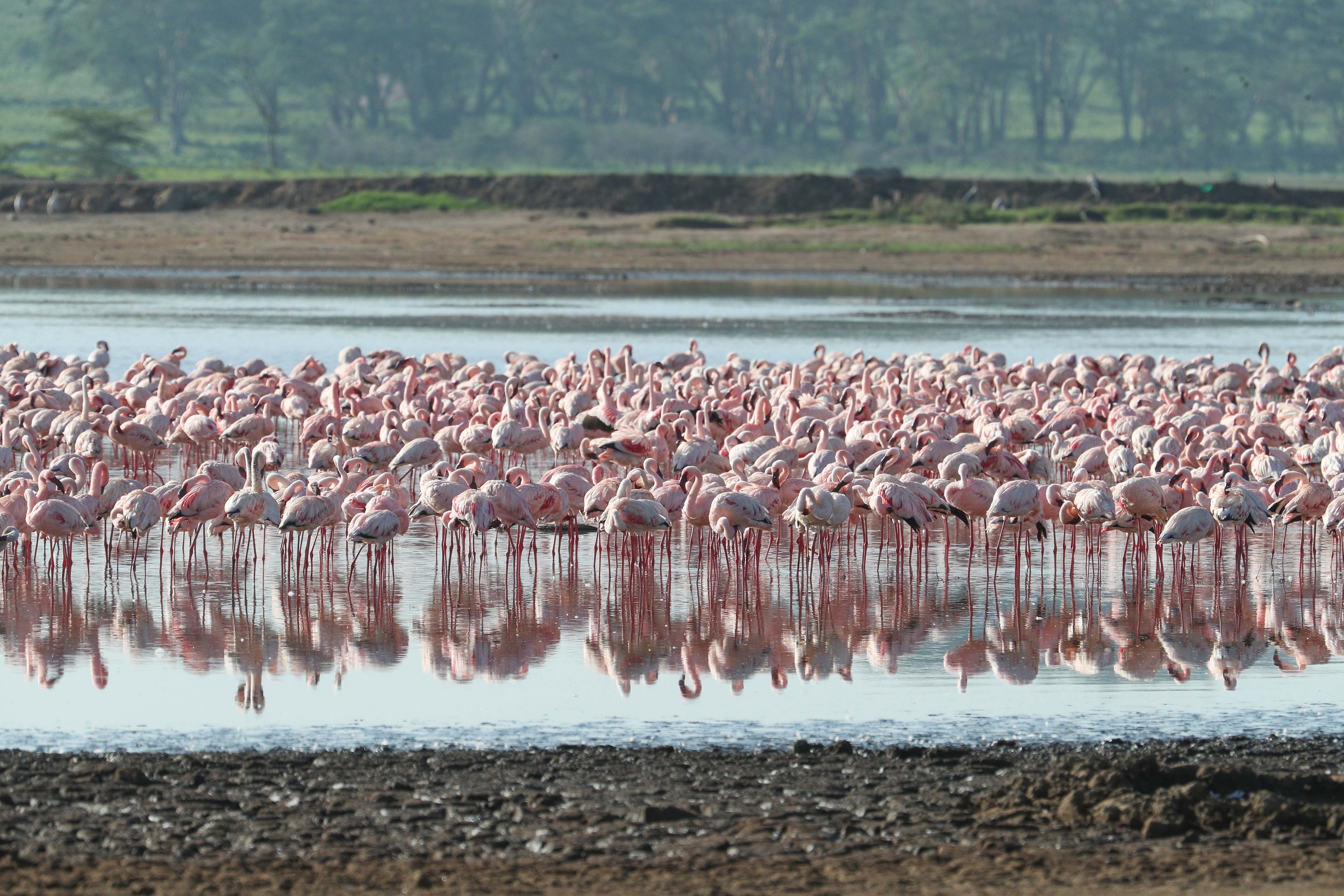 火烈鸟以其粉红色羽毛而闻名。纳库鲁湖国家公园官方网站显示,火烈鸟主要以蓝藻、虾和少量水虫为食。纳库鲁湖富含蓝藻,使其成为火烈鸟理想的栖息地,最多时有超过100万只。