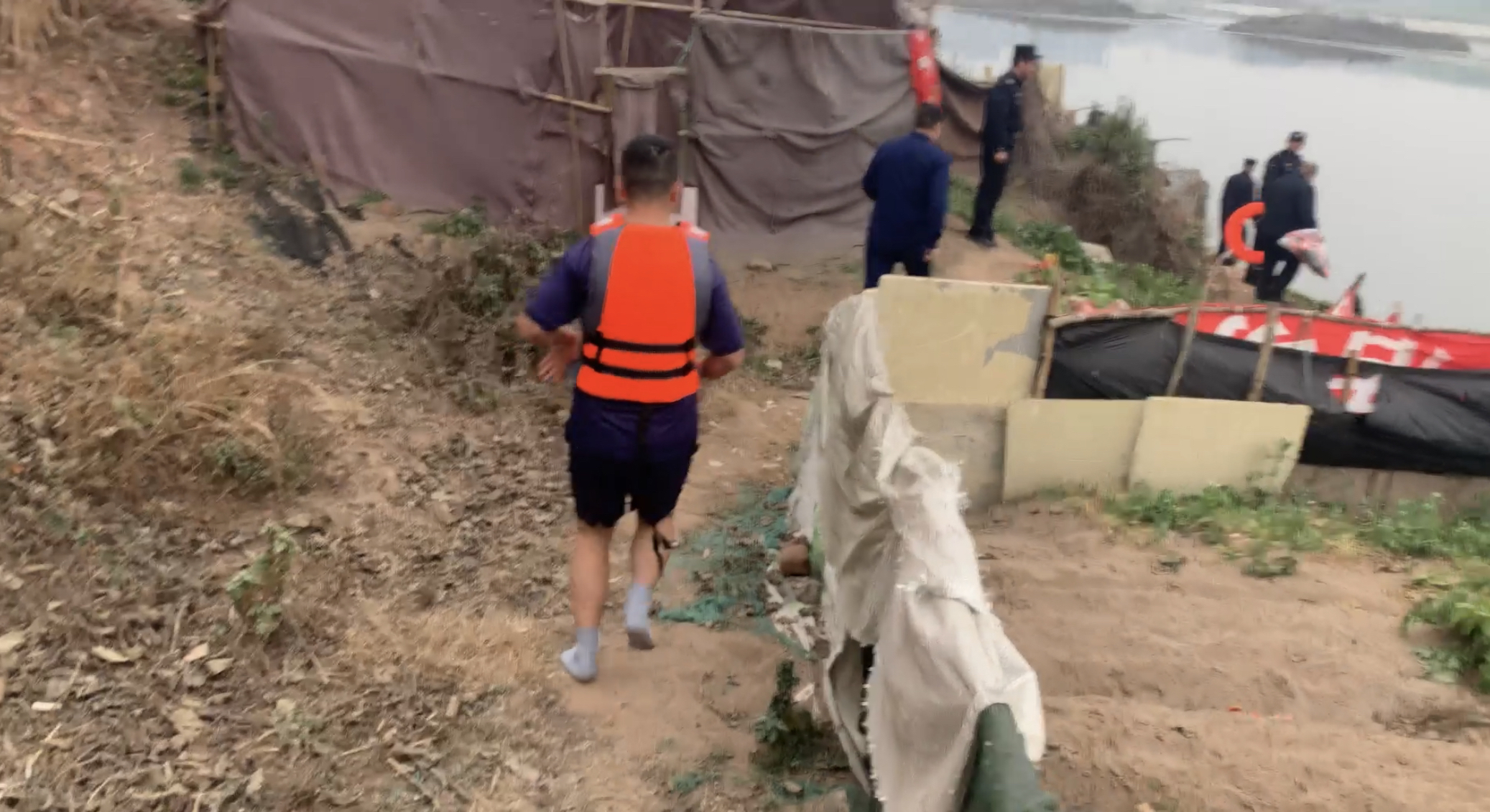 很快电话那头传来一个好消息,“刚刚山火的警情是误报,你们抓紧救落水者。”此时,一名消防员已经迅速脱下了厚重的战斗服,将救生衣套在短袖上衣外,系上安全绳系,抱着救生圈,一路狂奔进入冰冷的河水中。其他战友在接到指令后,也全部投入救援中,有负责拉住安全绳,有负责观察和现场指挥,也有一旁待命随时准备下河……
