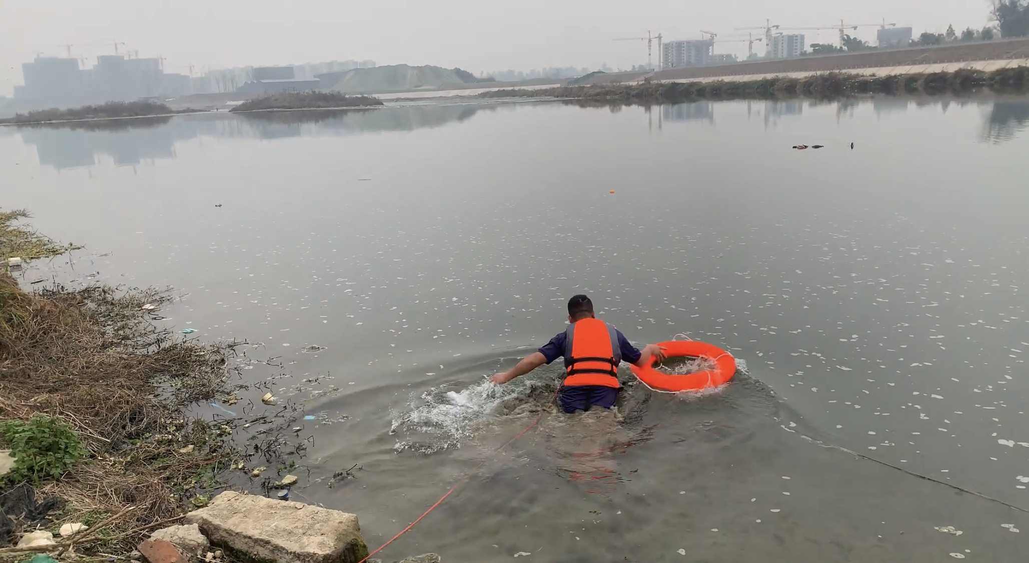 仅三分钟就将落水男子拖拽上岸