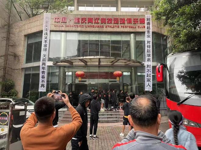 重庆两江竞技足球俱乐部大门两侧,悬挂的横幅尤为惹人注目。这是俱乐部球员和工作人员讨薪和求救的口号,也是重庆足球死亡的前兆。