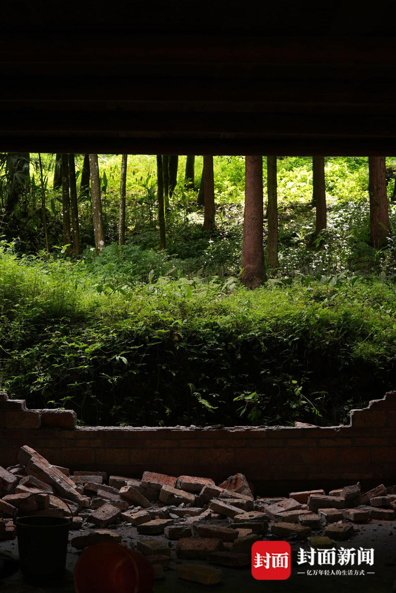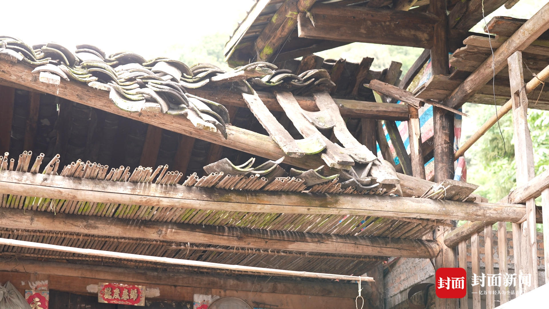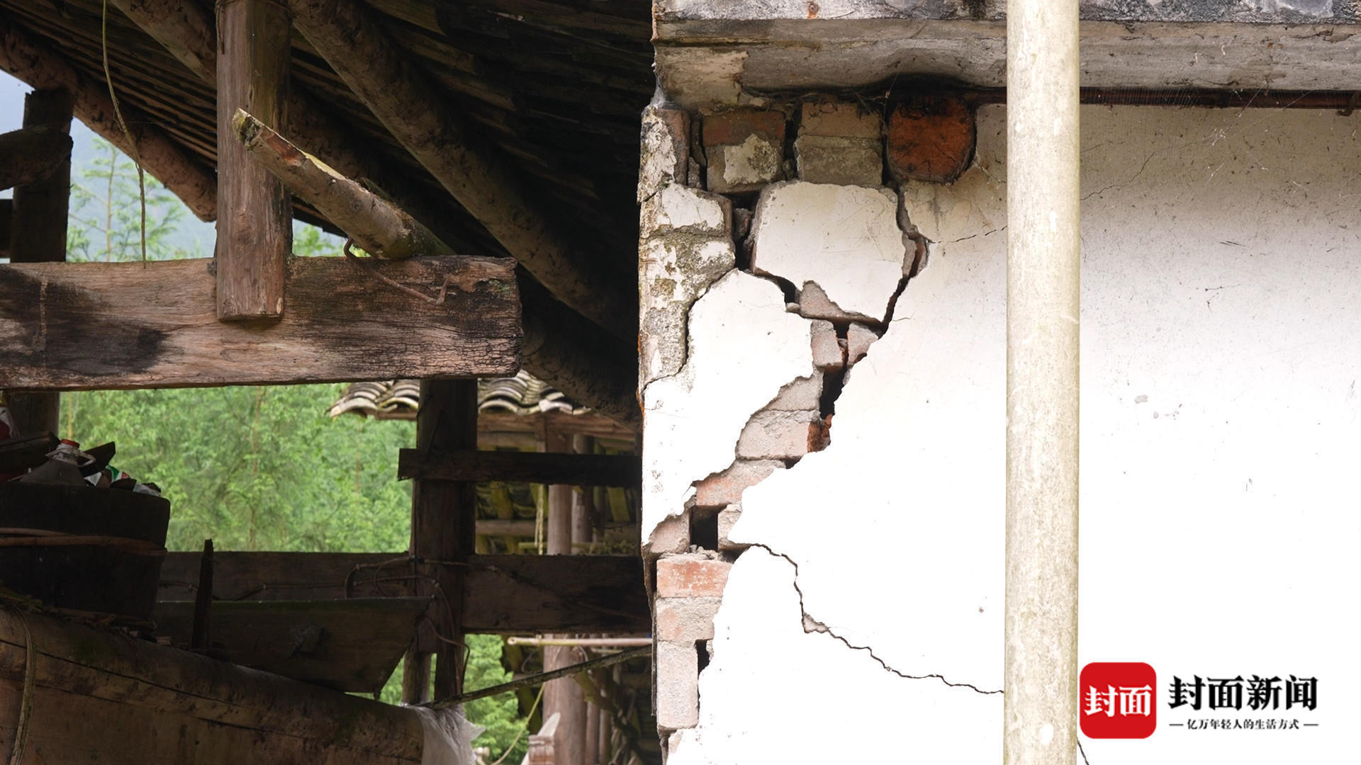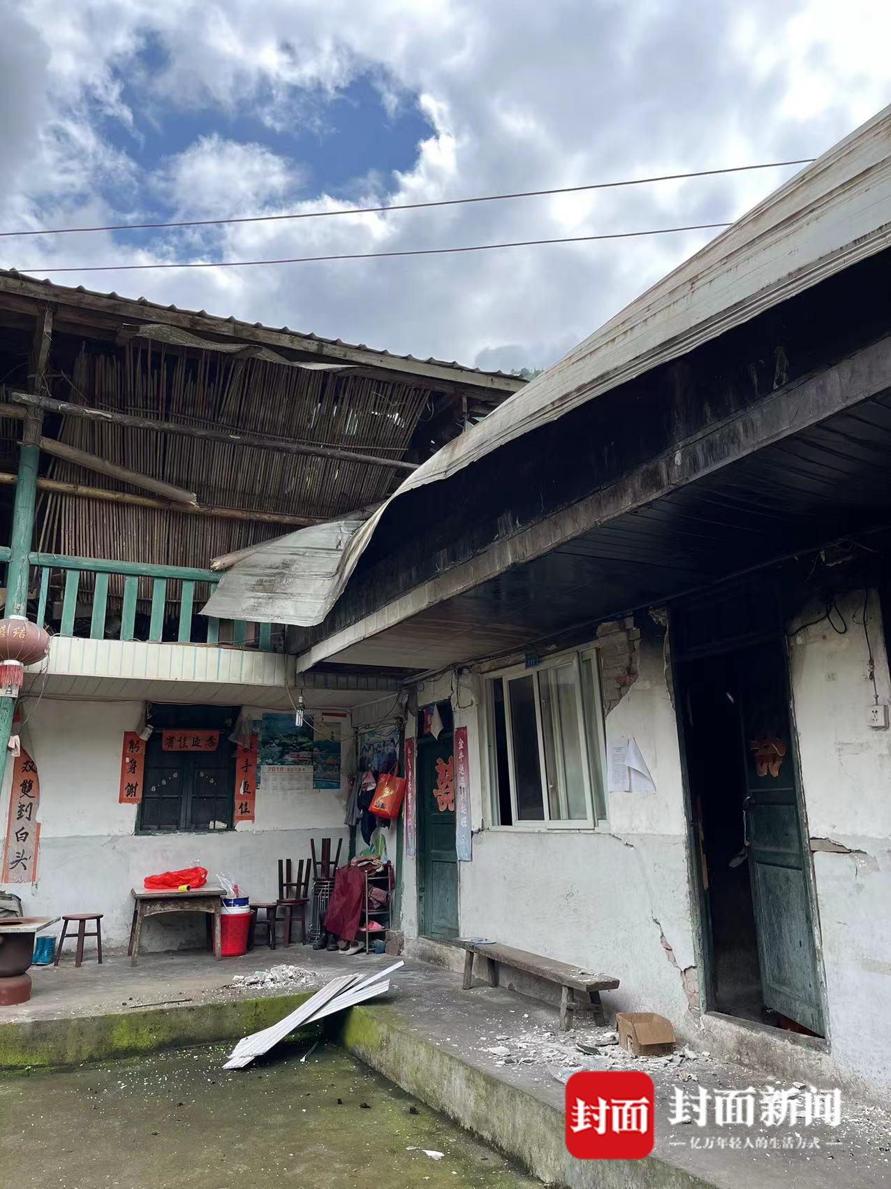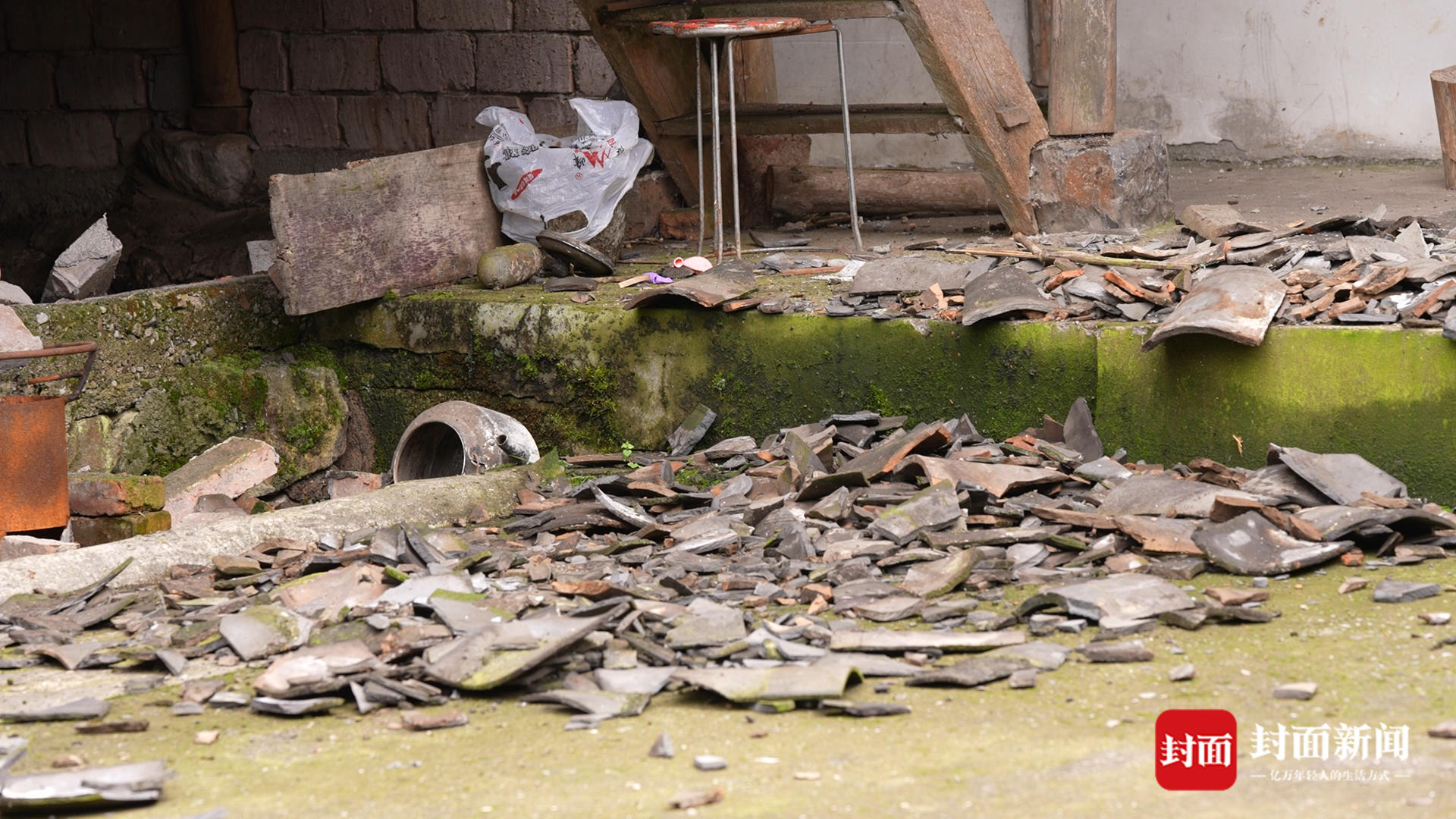 瓦窑溪组另一处院落,地上掉落着青灰色的瓦片。记者看到,这户人家的房屋受损相对严重,放置农具的房间,一面墙体破裂,砖块掉到了地上。