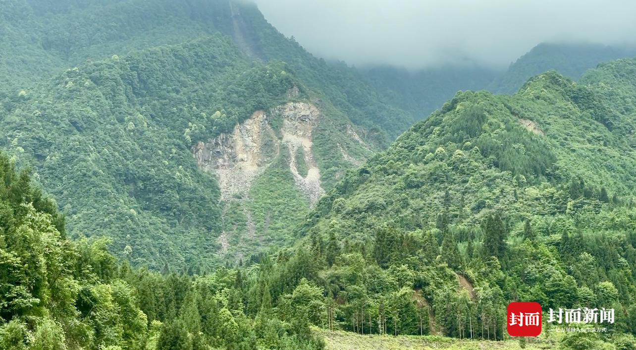 10分钟后,清理出一条车道,大家又继续向村中前进。经过一段铺满石头的河床时,能看到一些地震后掉落的碎石,向对面山上望去,绿油油中有一块刺眼的颜色,那是山体滑坡的痕迹,镜头拉近放大,还能看清落石的轨迹。
