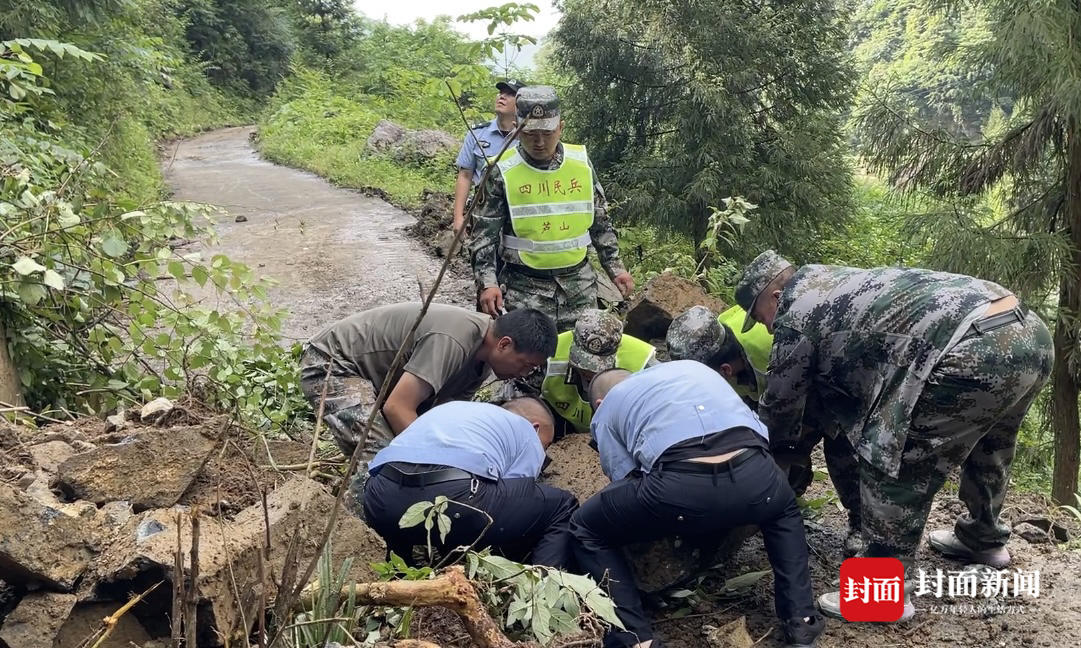 50余位民兵与民警,有些人围着巨石站成一圈,弯腰把重心降到最低,跟着口号合力一点点挪动巨石的位置;有人晃动着树干,试探着能将其折断的点位;还有人一边捡地面的碎石,一边观察着山体滑坡的坡面,以防有落石滚下时及时预警。