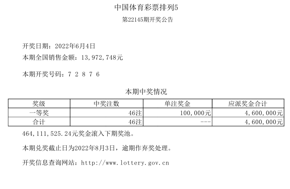 中国体育彩票排列5第22145期全国销售13972748元。开奖号码72876。