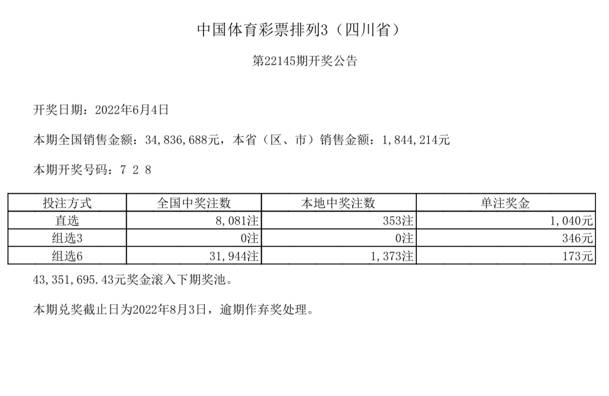 中国体育彩票排列3第22145期全国销售34836688元。开奖号码:728。