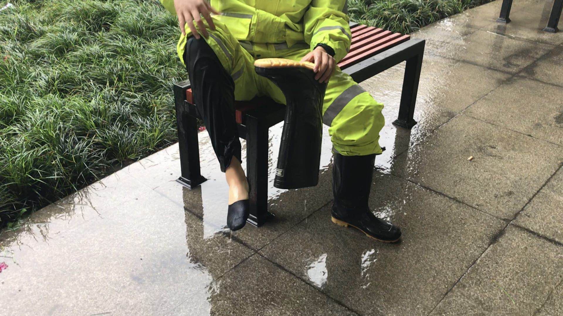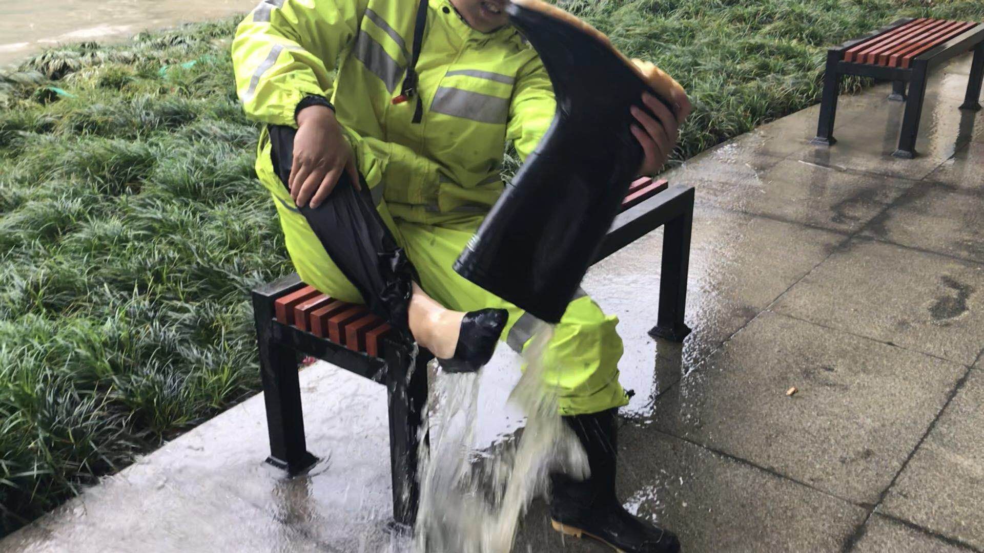 在他的照片里,“小黄人”们站在暴雨中,为来往的市民指路,提醒市民积水严重,不要再前行,但他们自己的脸上却早已被雨水打湿,雨靴里也渗进了一拨又一拨的积水,只能一次又一次反手将雨靴拔下倒水。