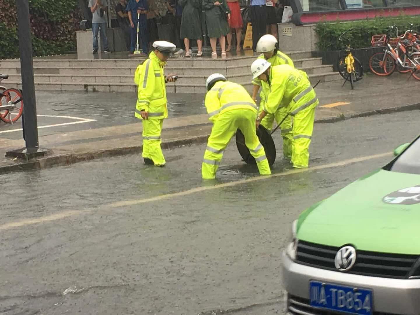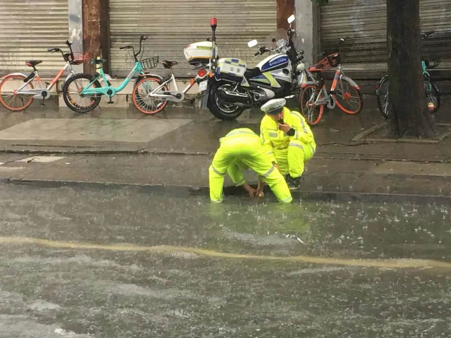 当天,为保障恶劣天气期间道路交通安全,预防路面积水过深影响车辆正常通行,交警一分局三大队执勤民警、协警手动打开下水道井盖,加快排水速度,同时摆放好锥形桶等警示标志,确保过往车辆、行人安全。