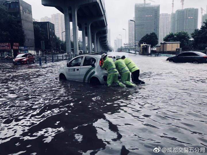 暴雨中,无数量私家车、公交车误入过膝积水,随后熄了火,无法动弹。接着,一幕幕暖心的画面上演,“小黄人”们涉水解救,又各自散开。私家车、面包车、公交车……一天下来,成都交警五分局的“小黄人”们已经记不清推过了多少辆车,他们只是上前帮忙,然后立即散开,赶去下一个地点。
