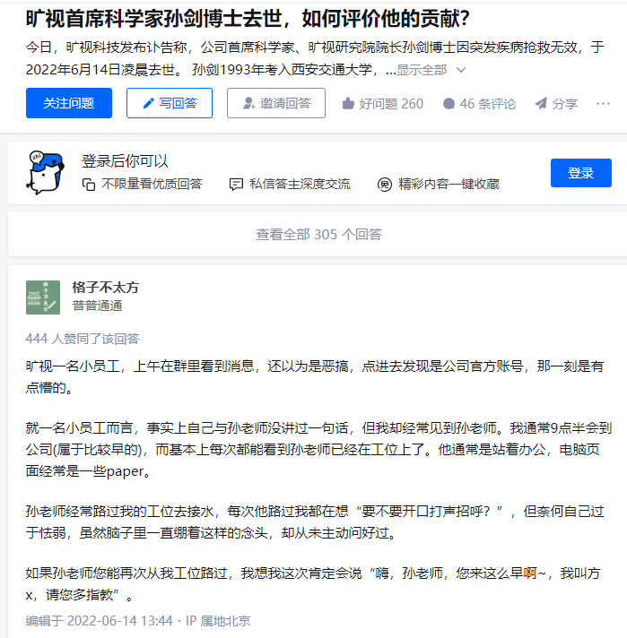 孙剑的突然离去,引发外界广泛关注。记者在知乎上看到已经建立起了“旷视首席科学家孙剑博士去世,如何评价他的贡献?”话题,目前该话题关注者超过2000人,浏览量超过440万次。