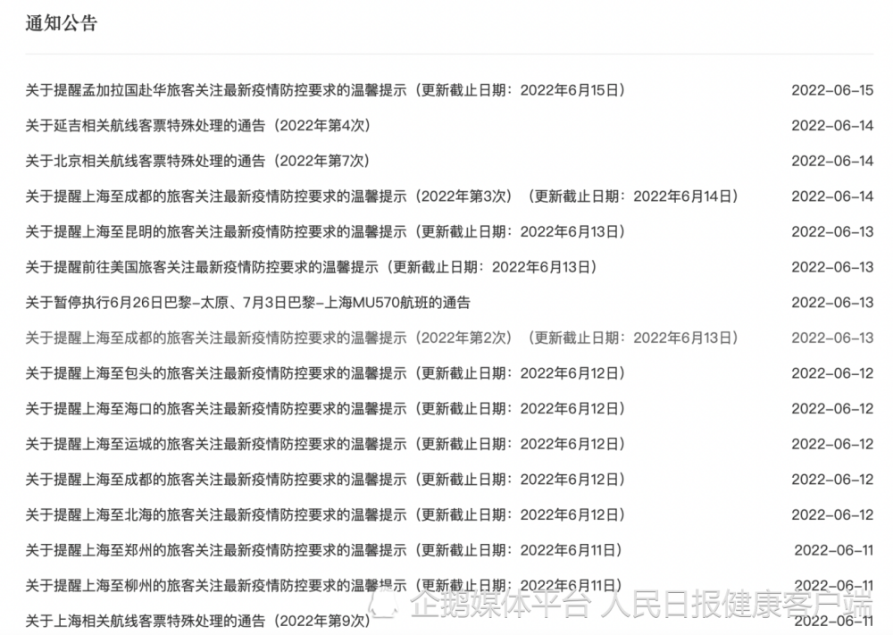 “请有上海进(返)成都计划的旅客提前做好准备,出行前务必提前了解当地防疫政策,并以有关部门发布的最新防控要求为准。”6月14日,东方航空网站上发出今年第3次关于提醒上海至成都的旅客关注最新疫情防控要求的温馨提示。