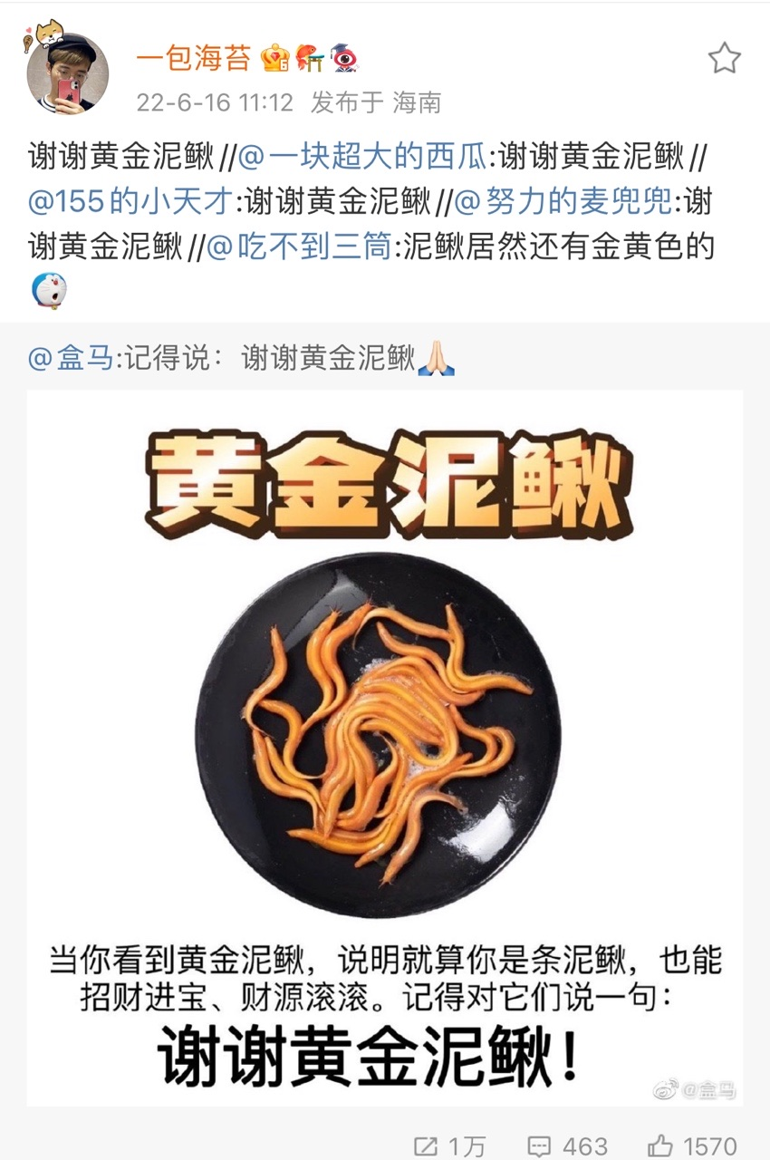 “就算是条泥鳅,也能招财进宝、财源滚滚……”有网友表示,自己把黄金泥鳅作为锦鲤的替代品,配上“谢谢黄金泥鳅”等文字的图片转发祈福。
