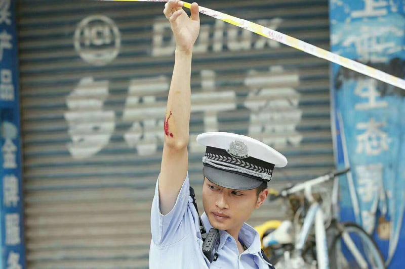 7月12日,当所有人都在紧张的抗洪防汛时,一张执勤民警身着警服,用带着血迹的右手抬高警戒线的照片打破紧张,温暖人心。