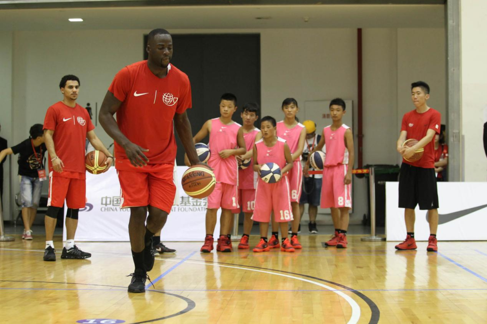 格林参加2015年姚基金慈善赛希望小学训练营,为小球员示范动作技术要领