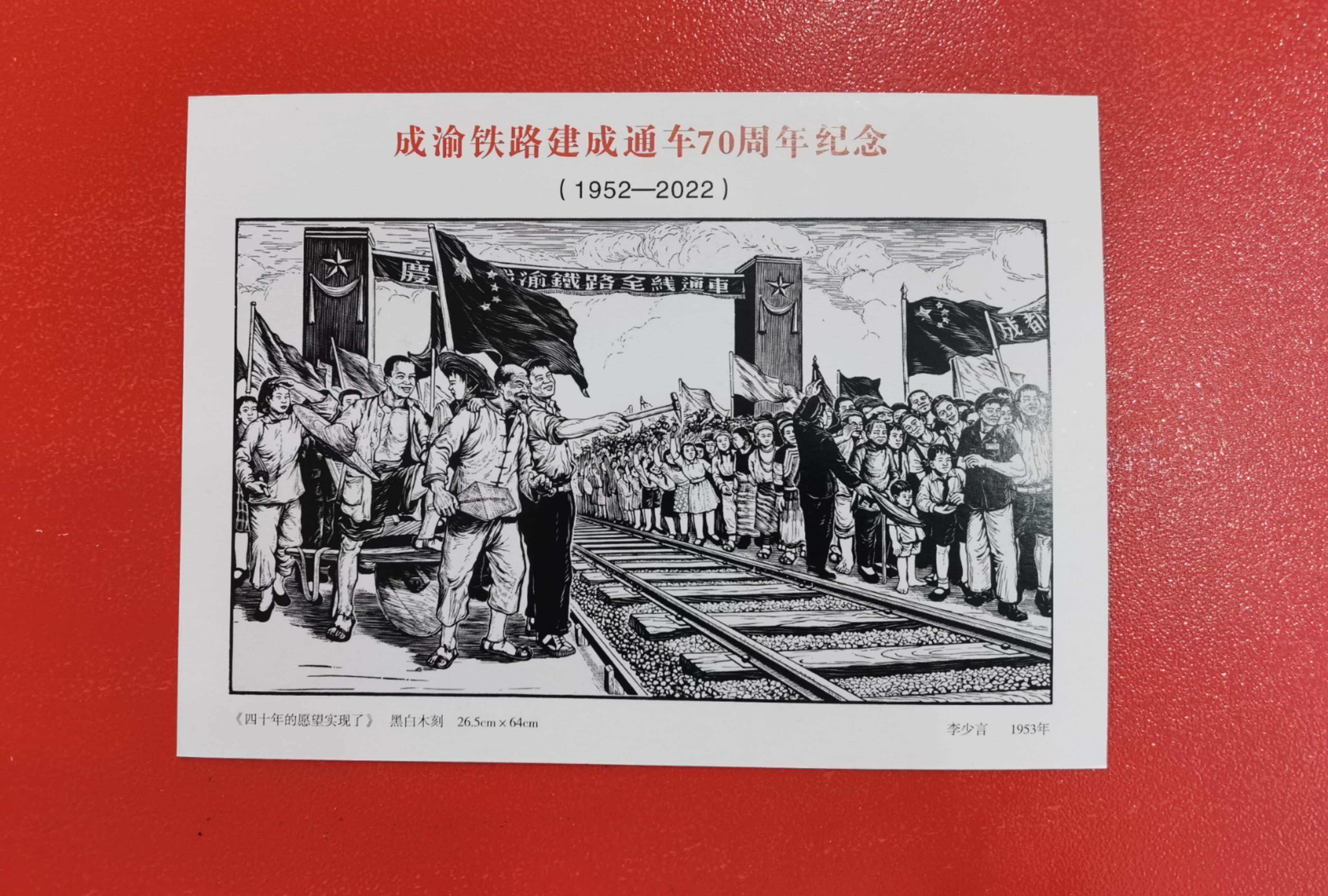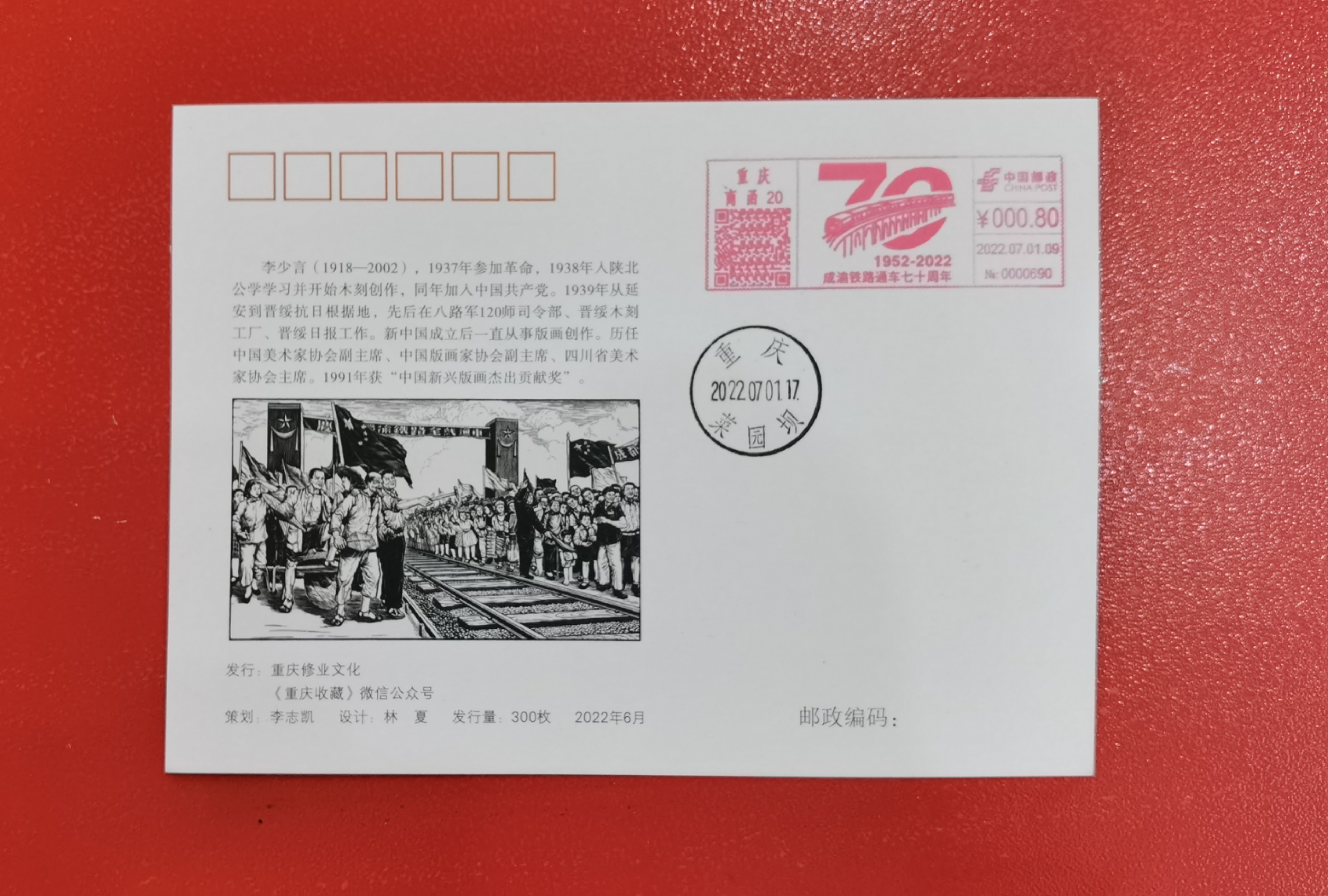 7月1日,新中国第一条铁路成渝铁路迎来70岁生日。这一天,中国邮政发行纪念封纪念成渝铁路通车70周年,纪念封的版画作品出自四川画家李少言之手。还是在这一天,大批重庆市民赶往当地邮局为这个纪念封留下印鉴。