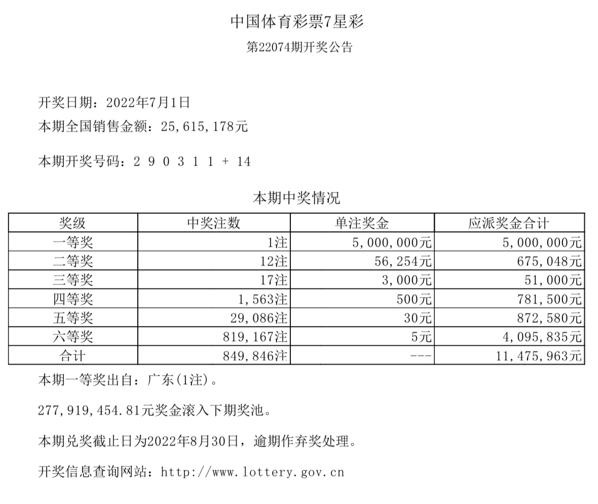 中国体育彩票7星彩第22074期全国销售25615178元。开奖号码:2 9 0 3 1 1 + 14