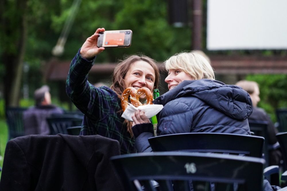 2021年5月29日,在德国首都柏林的一家户外电影院,两名女子在座位上自拍合影。新华社发(斯特凡·蔡茨摄)