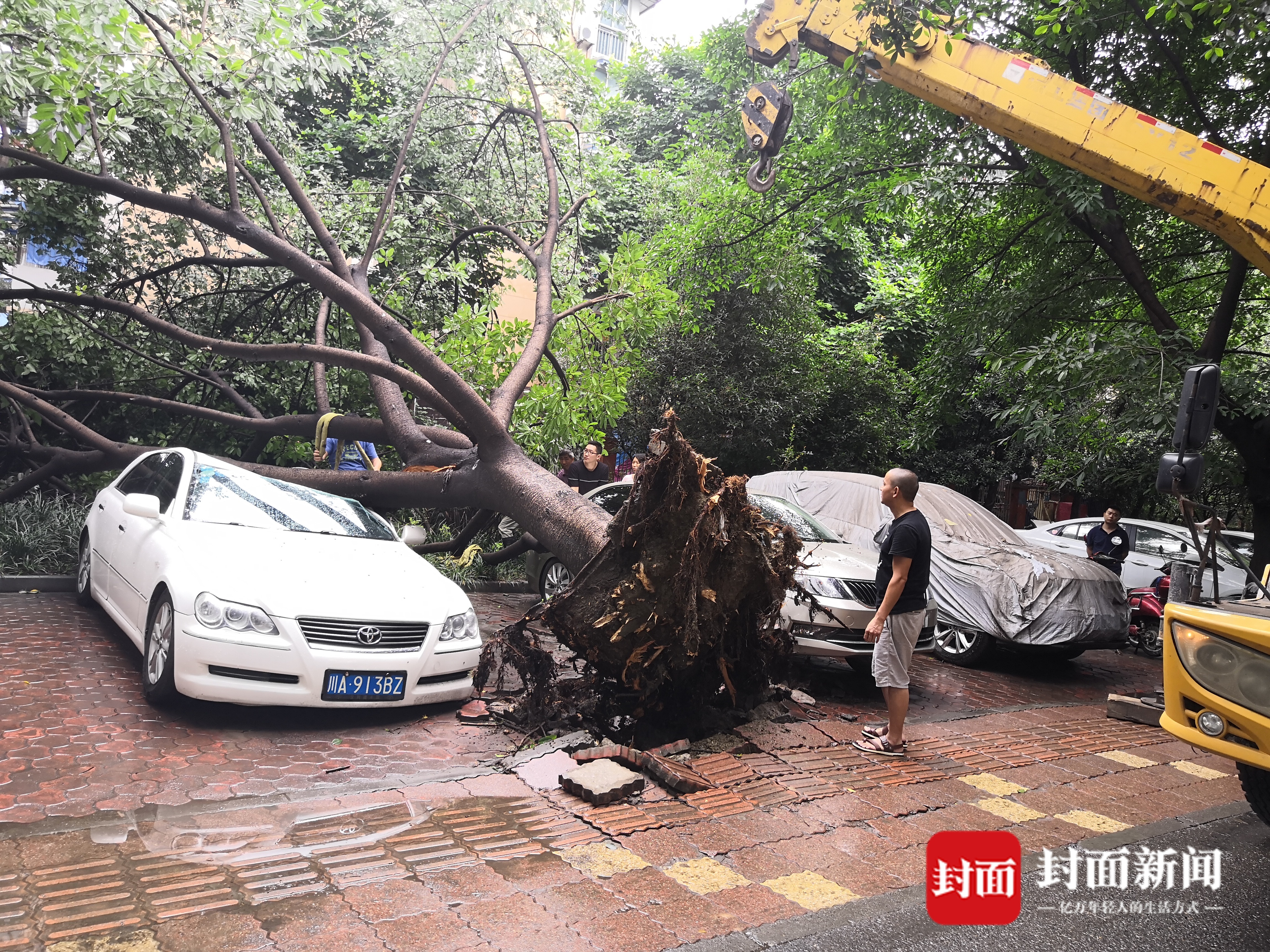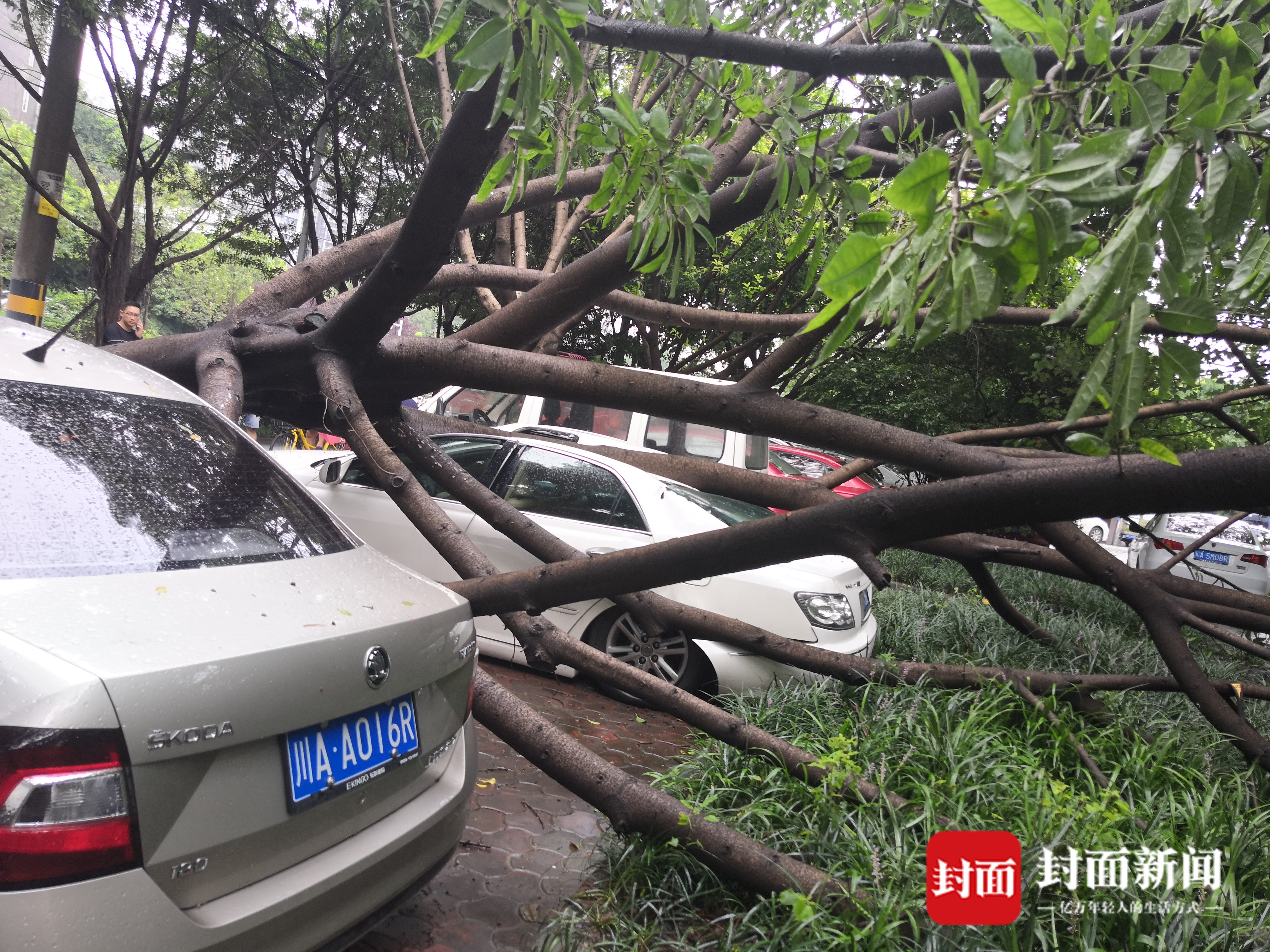 封面新闻(见习记者 宋潇 记者 李智)7月16日早上9:37分,市民王先生打热线反映,成都锦江区金象花园小区附近,一棵大树倒下,砸到路边两辆小车,给过往车辆和行人带来不便。