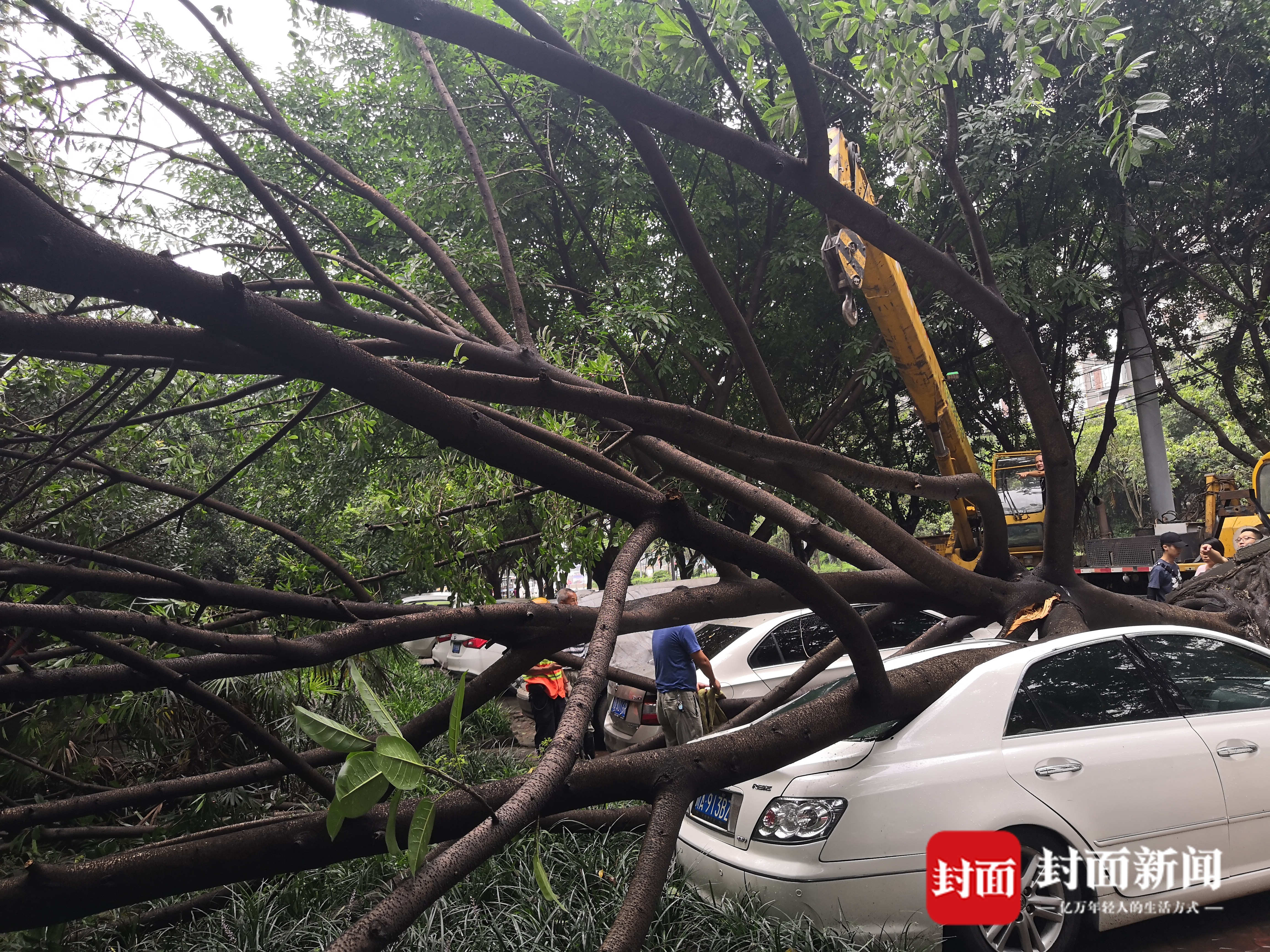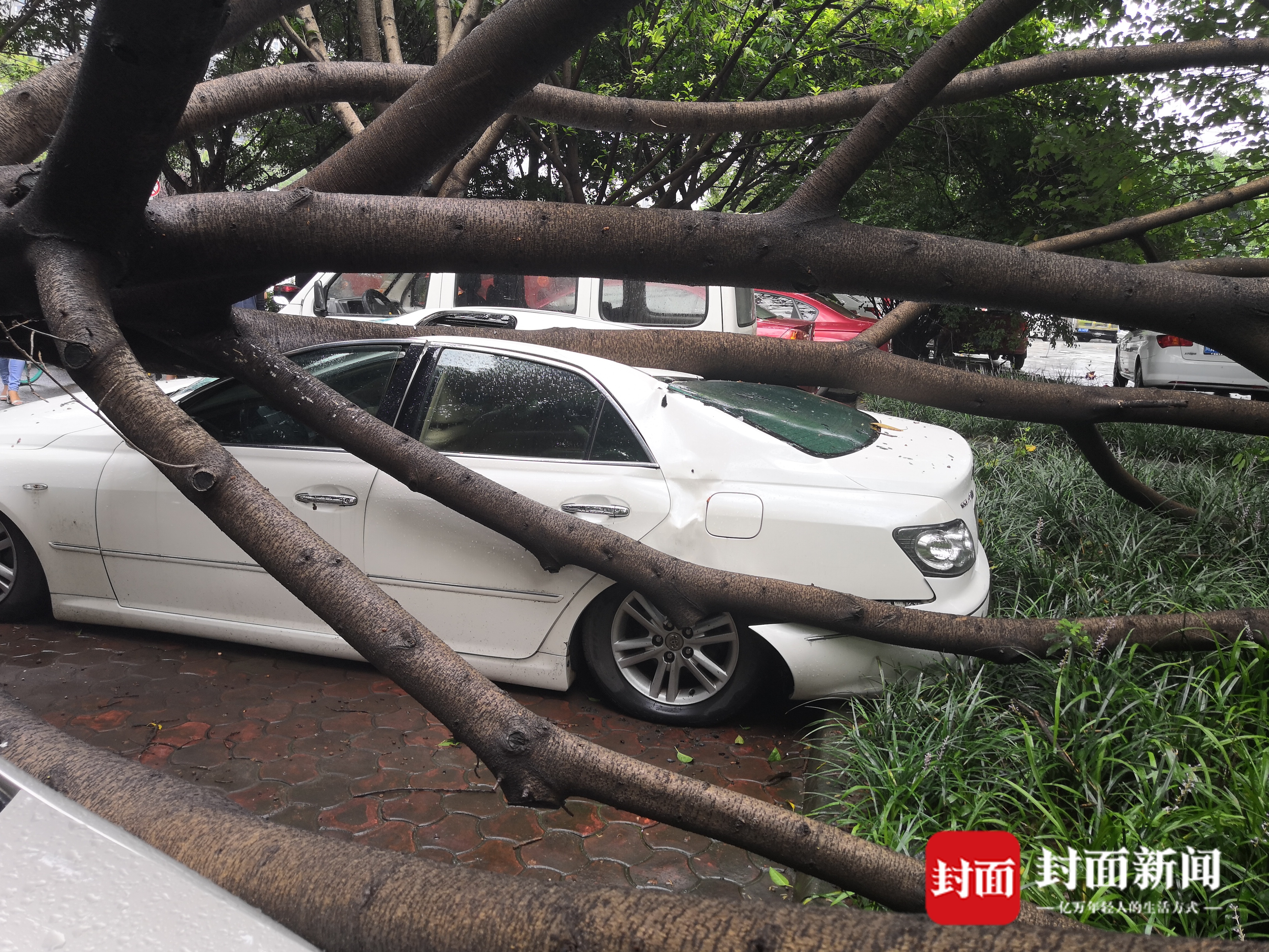 只见大树直接倒在一辆白色小车上,车顶被压扁,车身直接来了个“大变形”,大树的部分枝干还躺在旁边一辆灰色轿车上,过往车辆纷纷减速避让。