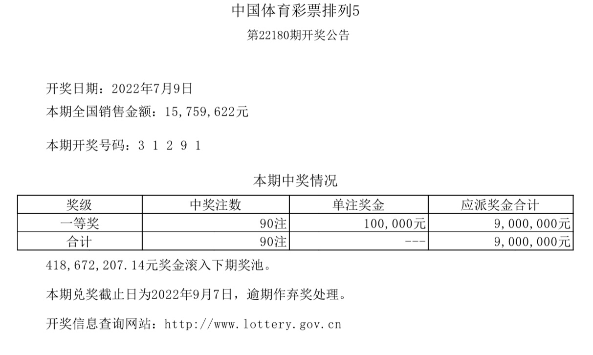 中国体育彩票排列5第22180期全国销售15759622元。开奖号码:31291。