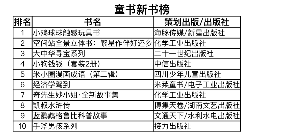 《小鸡球球触感玩具书》的畅销年份可谓“超长待机”,经全新升级,增加亲子阅读入门30讲后,在众多童书中脱颖而出,拔得年中童书新书榜头筹。科普图书方面,在航天事业进入“空间站时代”之际,化学工业出版社推出的《空间站全景立体书:繁星作伴好还乡》契合市场热点,引导孩子提前看见未来,拿下第二名的席位。其他几部入榜的原创童书,均是对孩子讲好中国故事的典范:《大中华寻宝系列》把“读万卷书 行万里路”的观念渗透给孩子,教育孩子要知行合一;讲四大名著的《凯叔水浒传》,教孩子感受英雄气概领悟国学经典;北猫的《米小圈漫画成语》,用幽默漫画快乐准确地学成语。