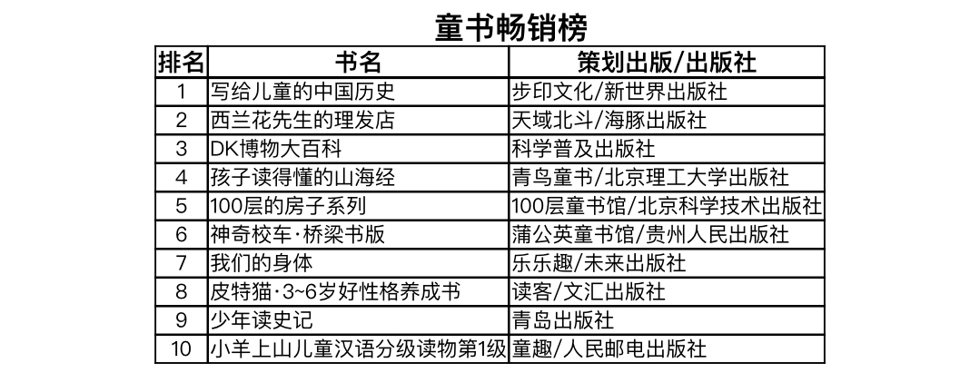 相关负责人表示,榜单背后的趋势可以看出在图书出版的道路上,热点从未乏人问津,经典总是历久弥新;影视剧与图书出版频繁互动,持续为图书热销注入生机;现象级自媒体大V“讲而优则写”,鲜活又有温度的输出,成为万千读者的精神食粮。在童书出版的赛道上,中国原创童书稳定保持传统国学、历史文化类图书的市场优势,引进版科普类图书仍是家长们更愿意为孩子买单的强势品类。