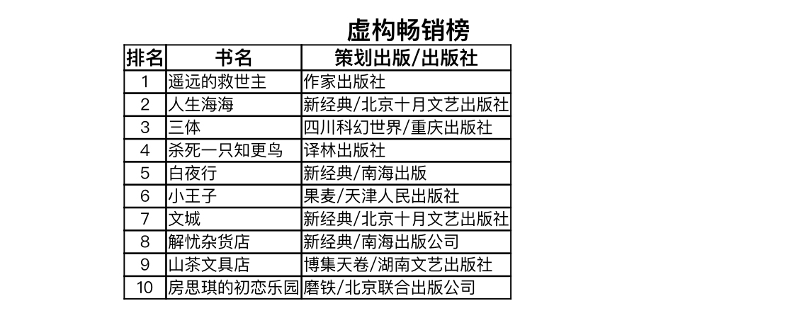 虚拟畅销榜上,出版自2005年的《遥远的救世主》数度加印,在虚构榜中一骑绝尘,夺得第一,《人生海海》《三体》分列第二、三名。东野圭吾的《白夜行》《解忧杂货店》和小川糸的《山茶文具店》则是因为图书作品被成功影视化,从而不断形成溢出效应为销售加持。在一众入榜小说中,欧美小说《杀死一只知更鸟》和《小王子》占据两席。除了“神秘的”豆豆,麦家的《人生海海》、刘慈欣的《三体》和余华的《文城》仍是读者最心仪的本土作家;林奕含的绝笔之作《房思琪的初恋乐园》用小说照亮现实,至今仍产生无数回响。