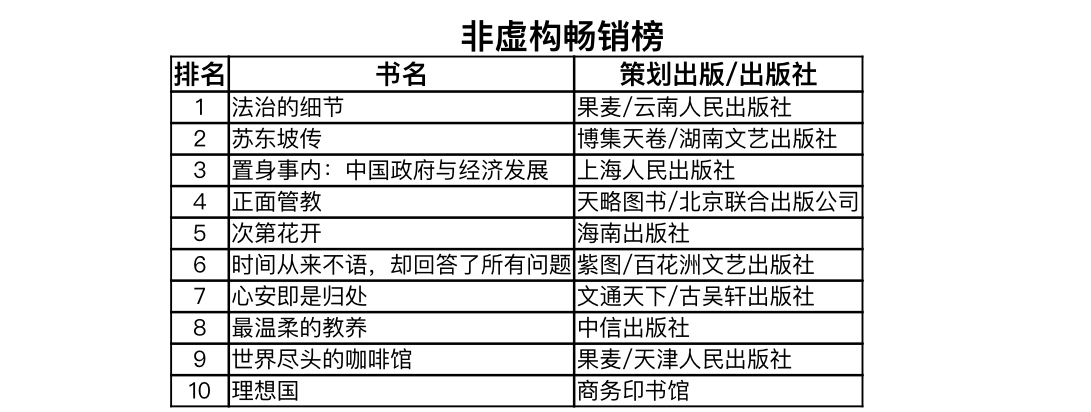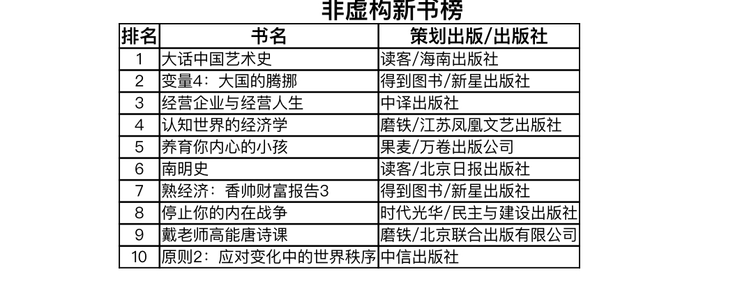 非虚构新书榜TOP10中,一半席位被投资理财和经管类图书占据。两本心理学图书上榜,艺术、文学、历史类图书各据一席。纵观整体榜单,自媒体、大V、达人产出优质内容,在忠实用户的拥趸之下,进军图书出版领域自然水到渠成。