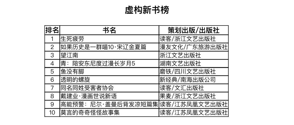 虚构新书榜中,莫言的的两部作品盘踞首尾两端,一部长篇小说《生死疲劳》与18篇中短篇小说《莫言的奇奇怪怪故事集》互为呼应;用漫画的方式讲好文学与历史,已被部分出版商屡试不爽,肥志编绘的宋辽金夏史和戴建业的漫画世说新语,都说明用对方法,文学可以很有趣;位于榜单TOP3的《望江南》,是茅盾文学家得主王旭烽沉潜26年的最新长篇力作。