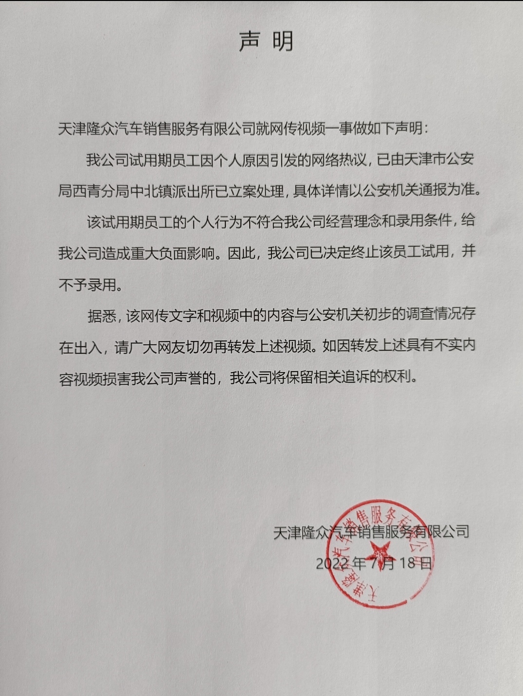 声明表示,该员工不符合公司经营理念和录用条件,对公司造成重大负面影响。因此,公司已决定终止该员工试用,并不予录用;网上流传的信息内容与公安机关初步的调查情况存在出入,请广大网友切勿再转发上述视频,如因转发上述视频损害公司声誉的,将保留相关追诉的权利。