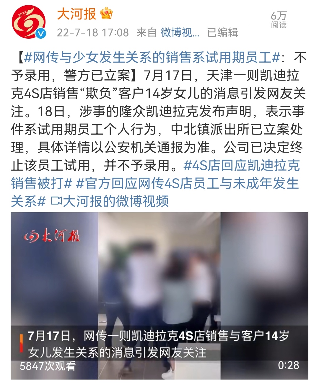 7月18日,有网友爆料,“天津隆众汽车销售服务有限公司员工,疑似与未成年女孩发生关系,被女孩父母追到店内殴打。”同时,还有一段在4S店内拍摄的视频在网络上传播。