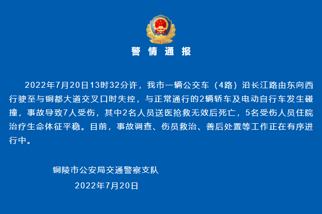 根据铜陵市公安局的通报,2022年7月20日13时32分许,铜陵市一辆公交车(4路)沿长江路由东向西行驶至与铜都大道交叉口时突然失控,与正常通行的2辆轿车及电动自行车发生碰撞,事故导致7人受伤,其中2名人员送医抢救无效后死亡,5名受伤人员住院治疗生命体征平稳。目前,事故调查、伤员救治、善后处置等工作正在有序进行中。