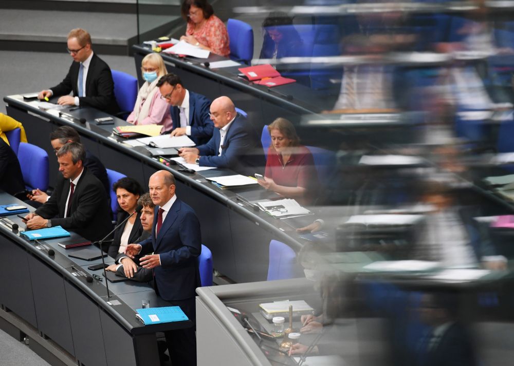 7月6日,德国总理朔尔茨(前右一)在位于柏林的德国联邦议会接受例行问询。(新华社记者任鹏飞摄)