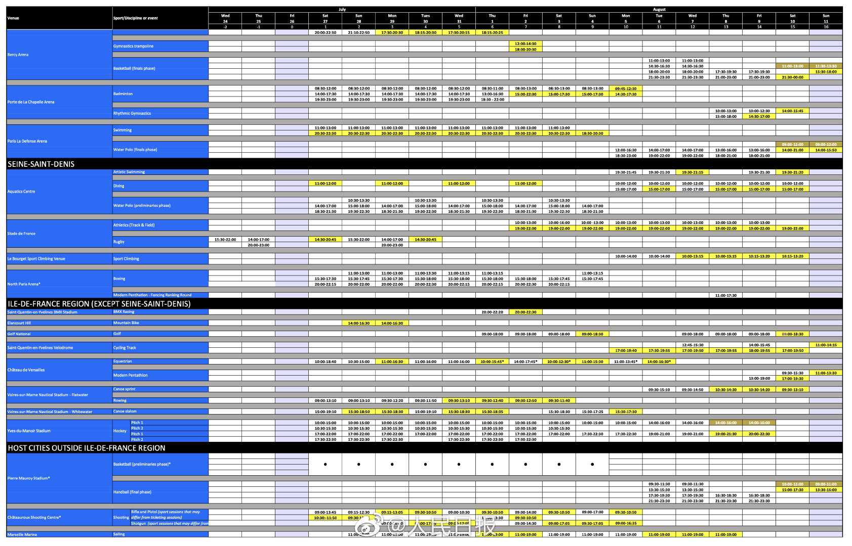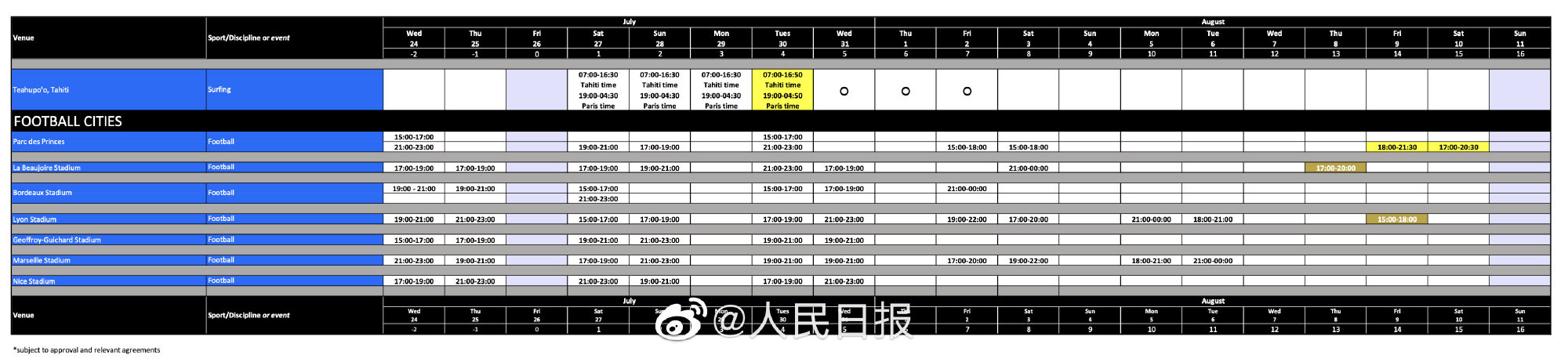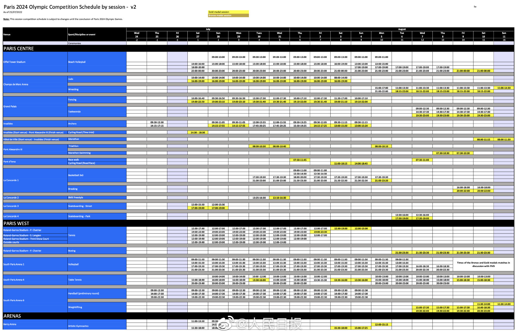 转存!巴黎奥运会比赛日历 @人民日报 2022-07-26 14:23 38384 北京时间7月26日,巴黎奥运会倒计时两周年之际,巴黎奥组委在官网上公布了巴黎奥运会初版赛程,比赛将于2024年7月24日(开幕式前两天)至8月11日进行。 评论 1 tang 2022-07-26 巴黎奥运会 我要评论