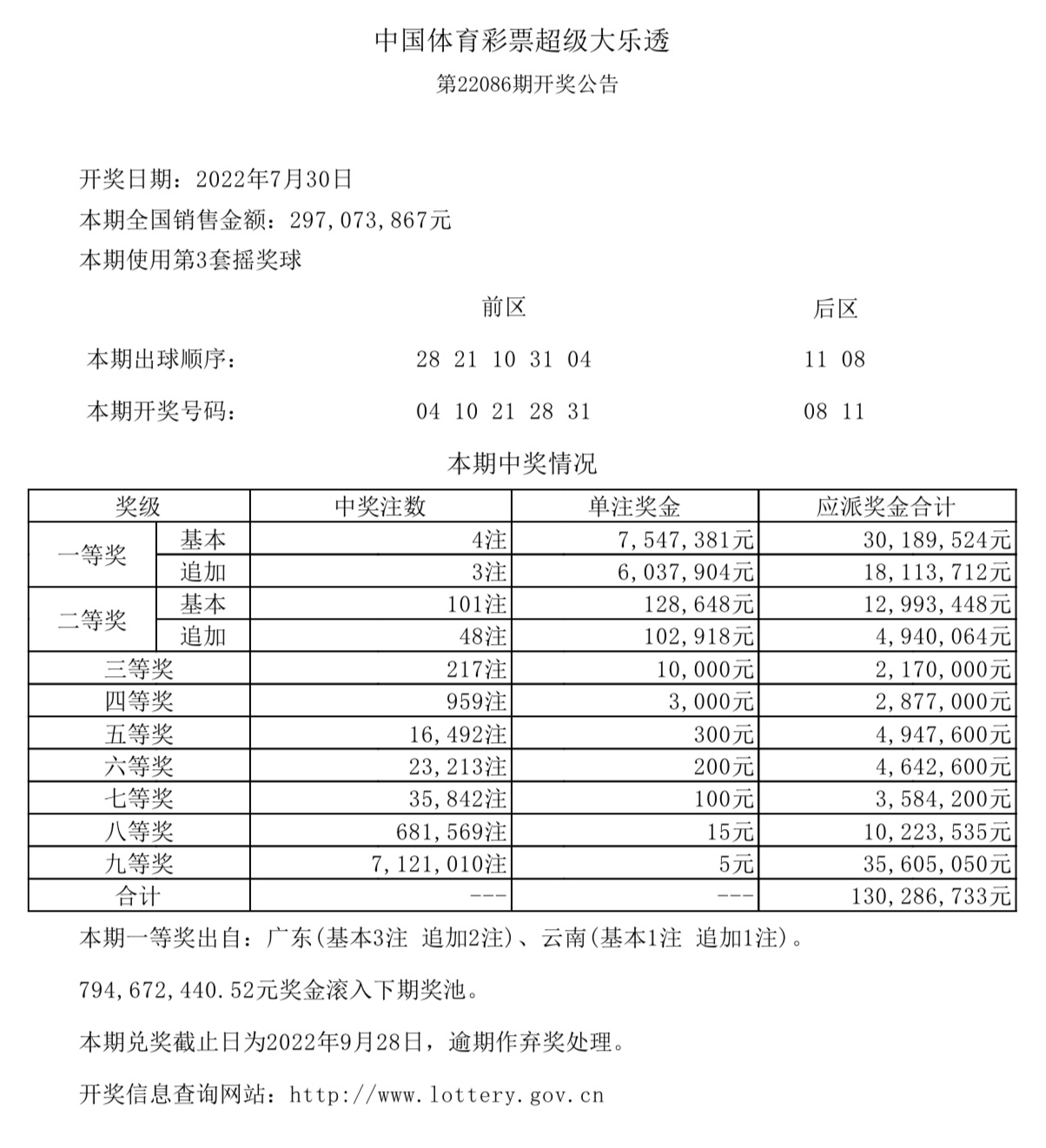 中国体育彩票超级大乐透第22086期全国销售297073867元。开奖号码:04 10 21 28 31 08 11。