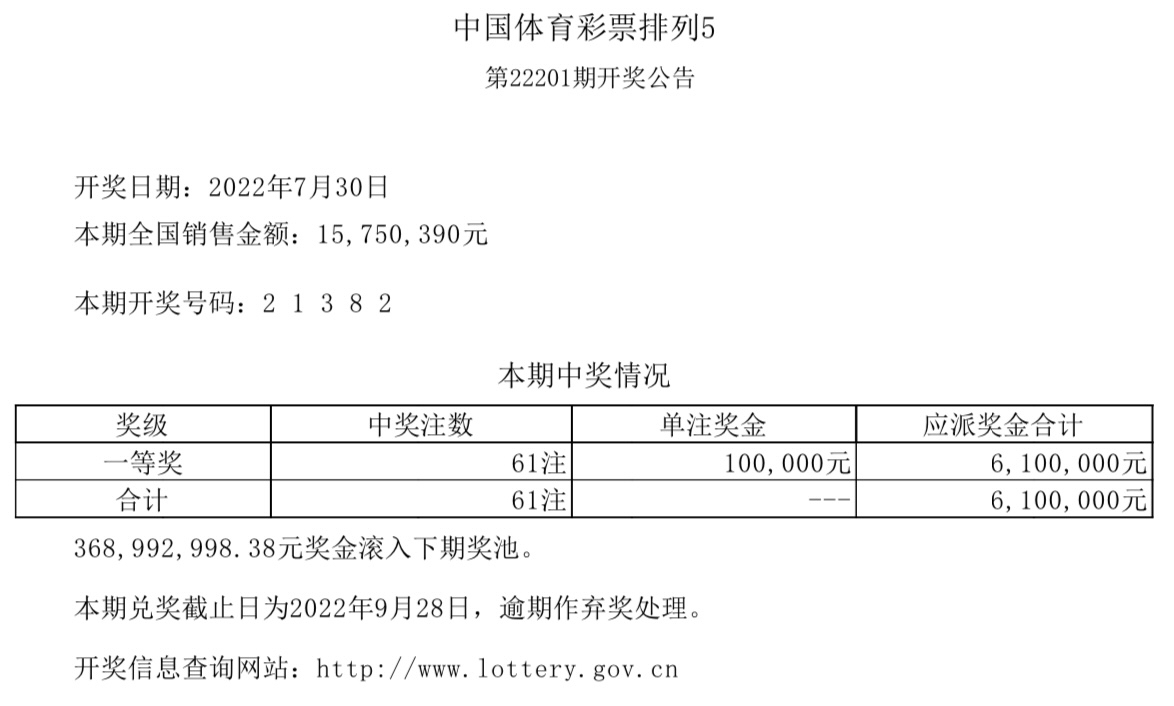 中国体育彩票排列5第22201期全国销售15750390元。开奖号码:2 1 3 8 2。