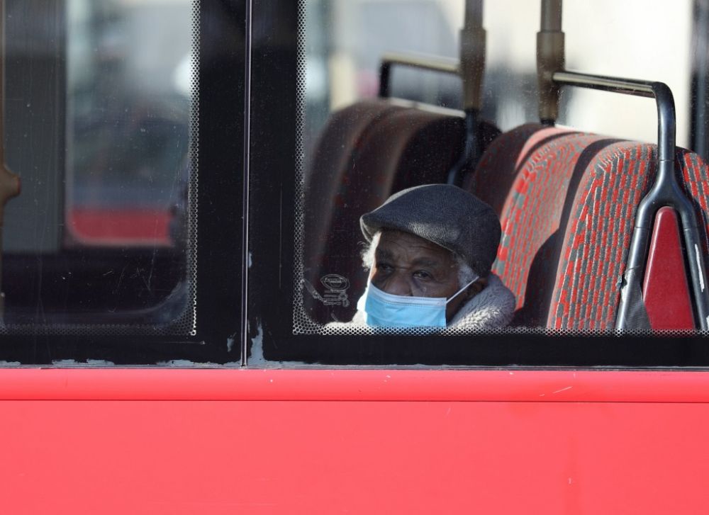 3月27日,在英国伦敦,一名老人佩戴口罩乘坐公共汽车。新华社记者李颖摄