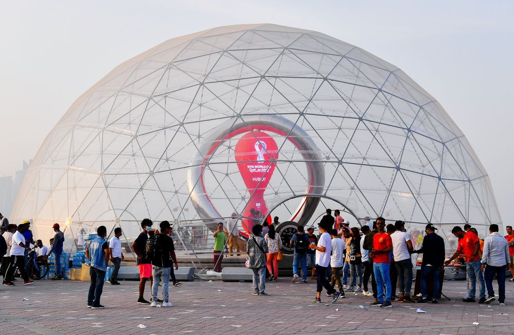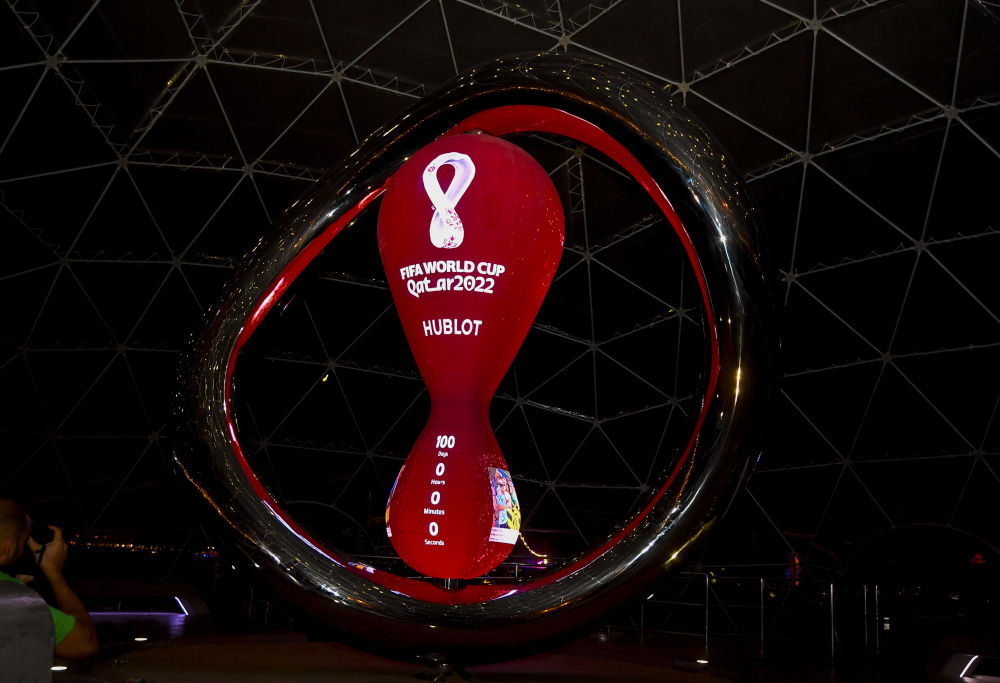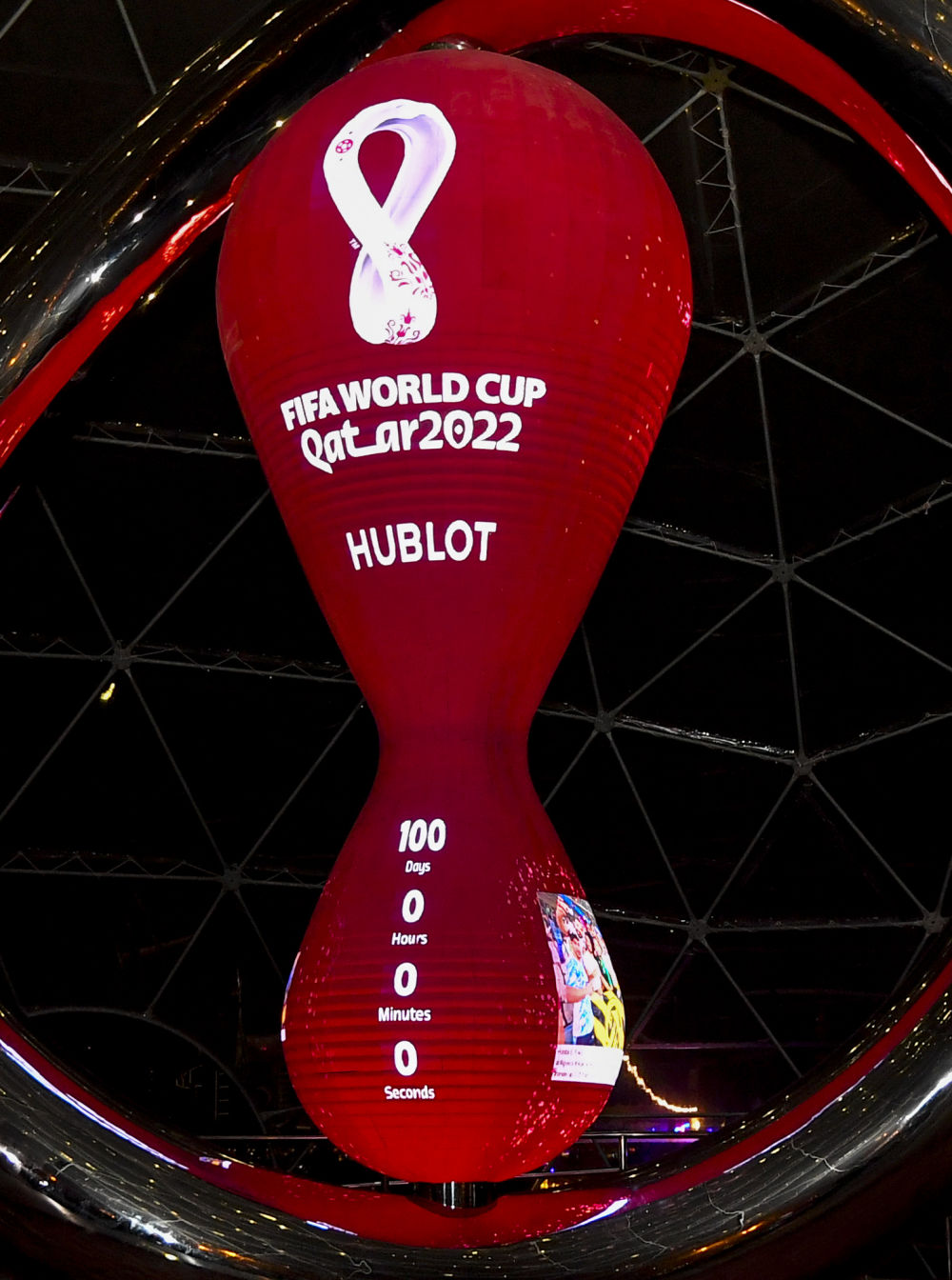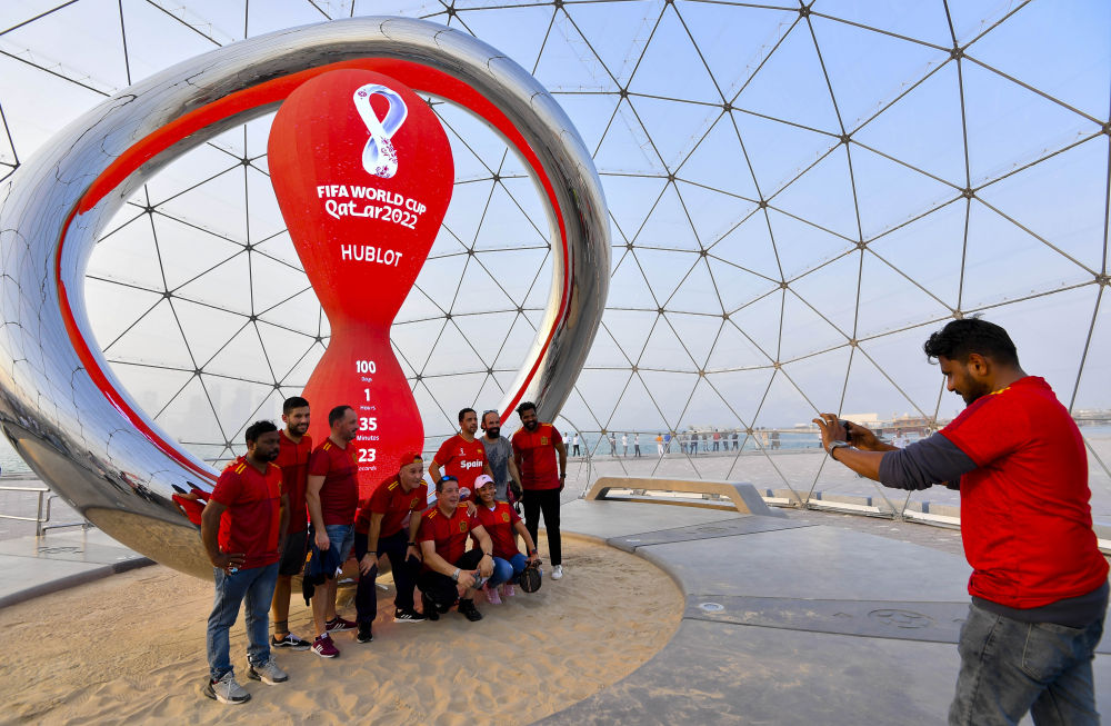 ↑8月12日,球迷在2022年卡塔尔世界杯倒计时钟前合影。