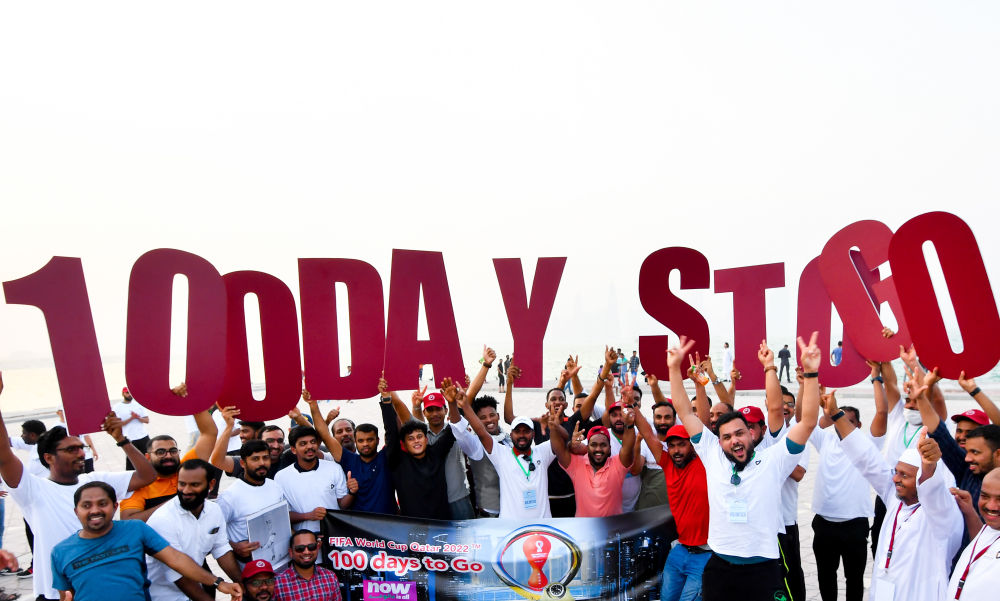 当地时间8月12日, 距2022年卡塔尔世界杯开幕还有100天,组委会在多哈海边大道举行100天倒计时仪式。