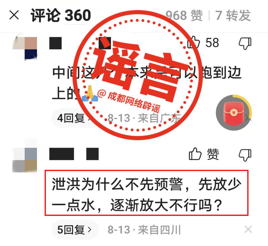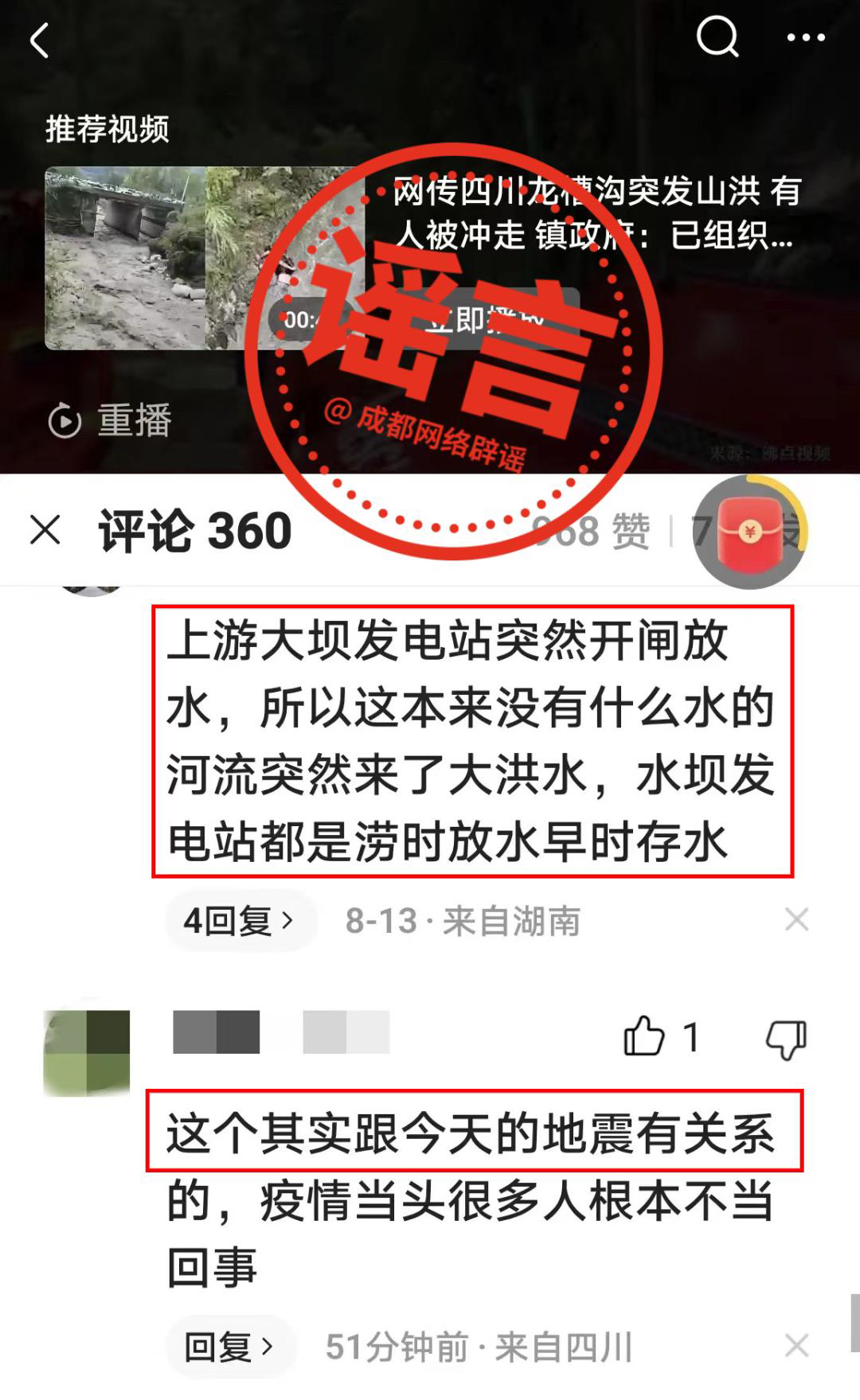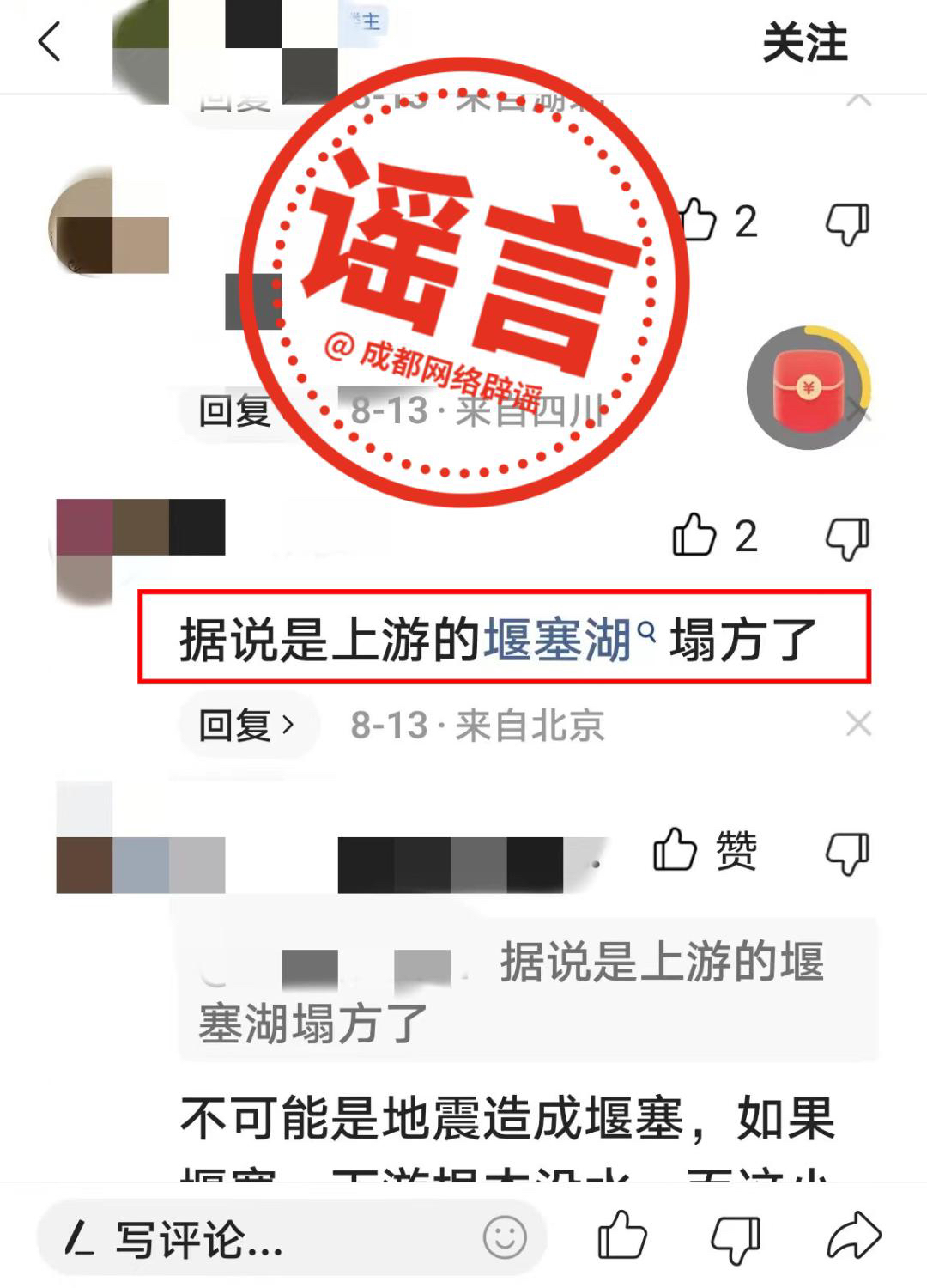 有个别网民不断散布“上游大坝发电站突然开闸放水引发山洪”“山洪是由地震形成的堰塞湖塌方导致”等言论博取眼球,将事故原因与都江堰8月13日13时18分发生的3.3级地震联系在一起。