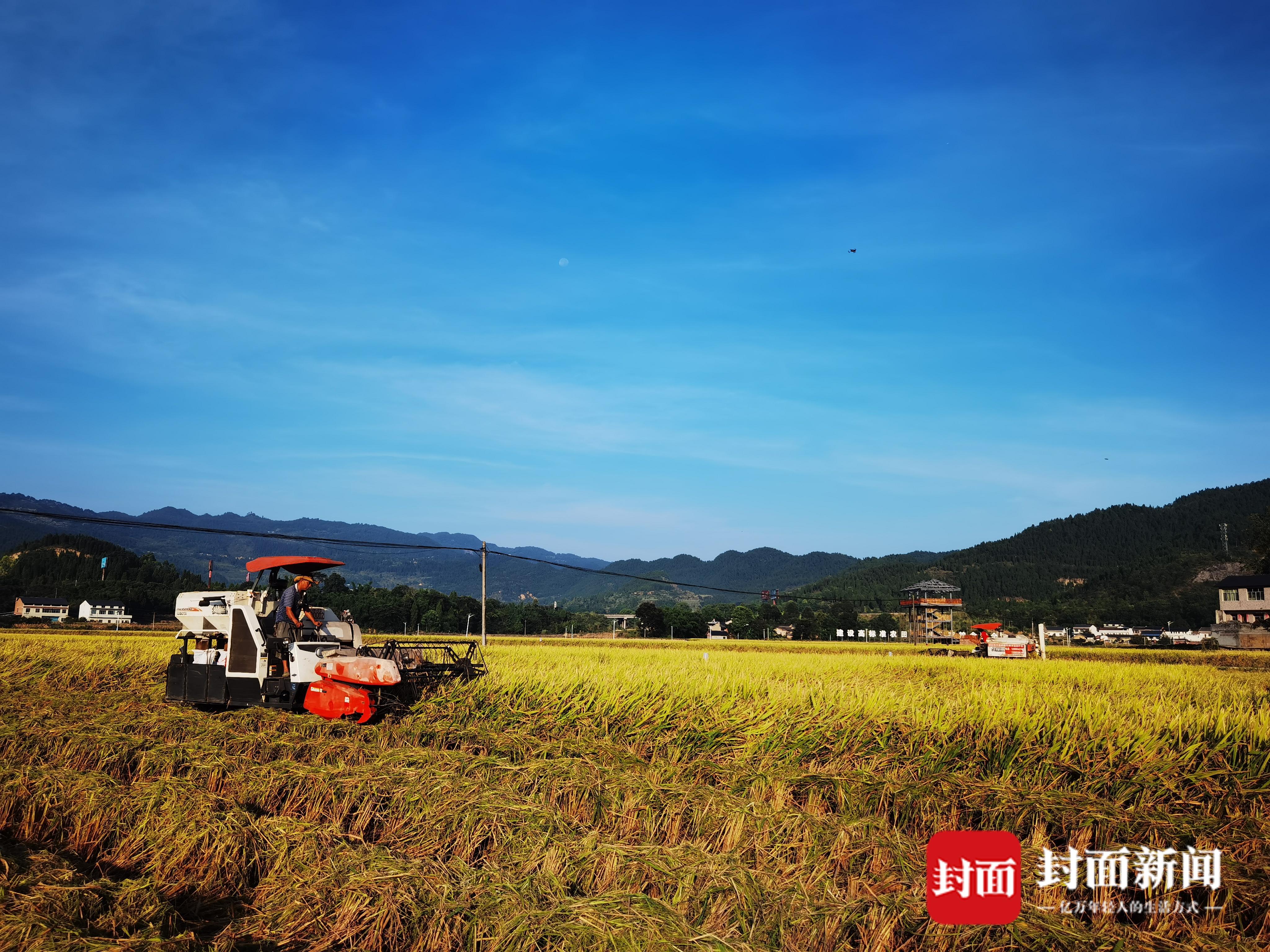 8月15日,四川省内江市威远县新场镇粮油现代农业园区,连片的稻田迎来丰收。湛蓝的天空,飞舞的燕子,金黄的稻穗,构成了一幅美丽的乡村画卷。今年由于改良了播种方式,这片850亩的稻田预计产量将达50万公斤。