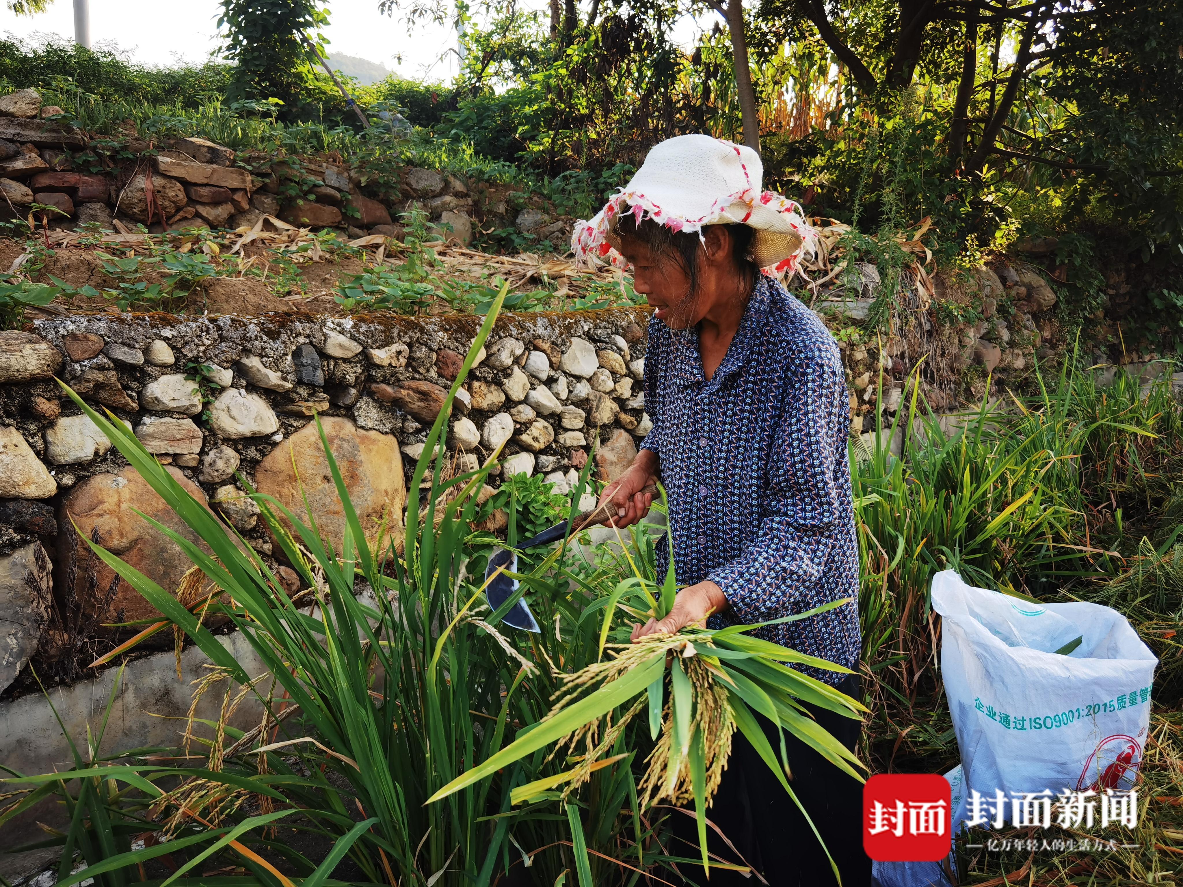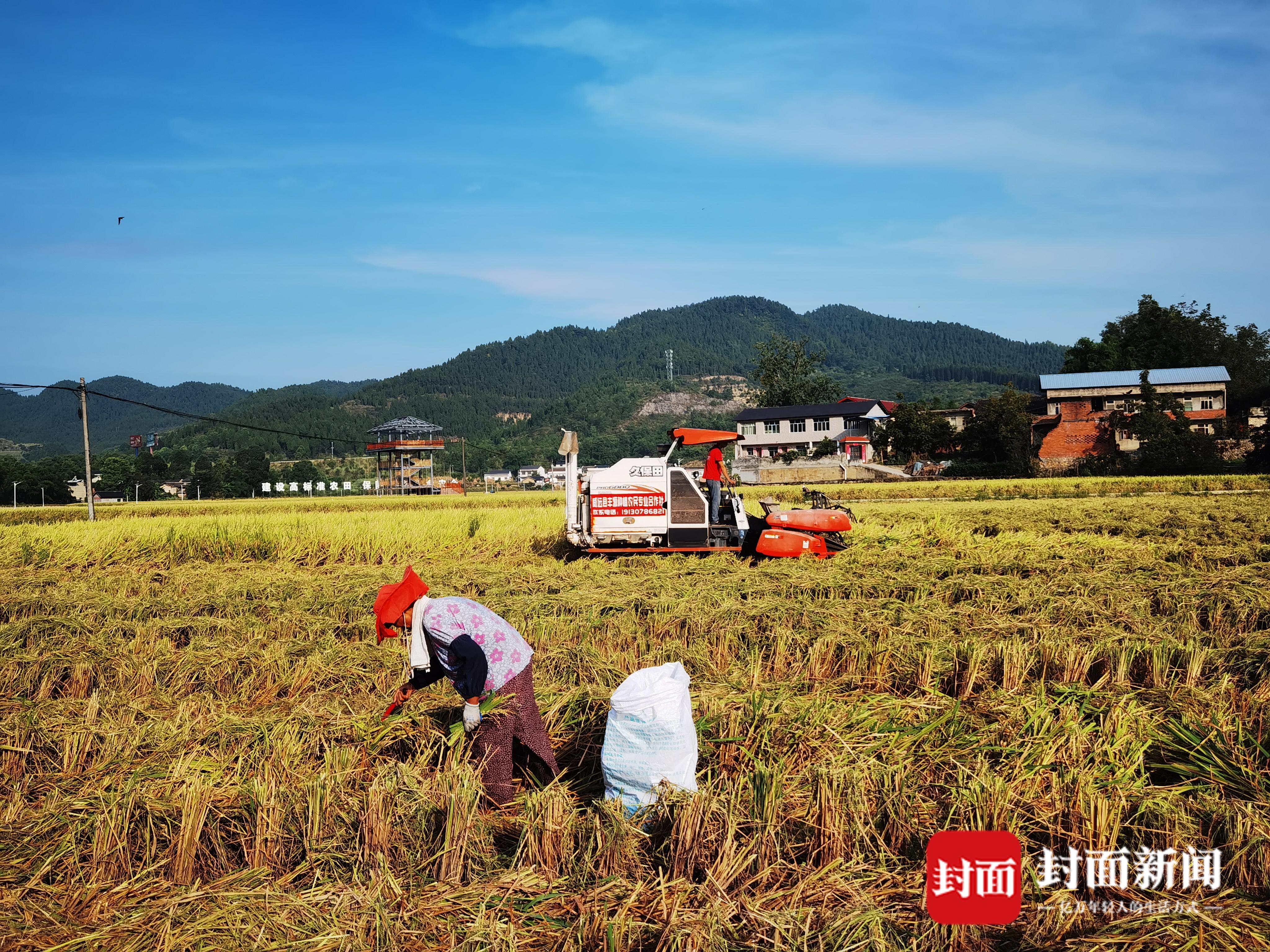 稻田里,两台收割机来回穿梭作业,一粒粒稻谷从收割机后仓脱秆而出。收割机工作过区域,农民们则采用镰刀割的方式,将机器遗漏的稻穗割下来,装进口袋,最大限度地增加收成。67岁的方凤明就是其中之一,虽然只是农田主请来的工人,但她还是十分心疼洒落的稻谷,不由得啧啧可惜,连忙叫同伴去拿扫帚。