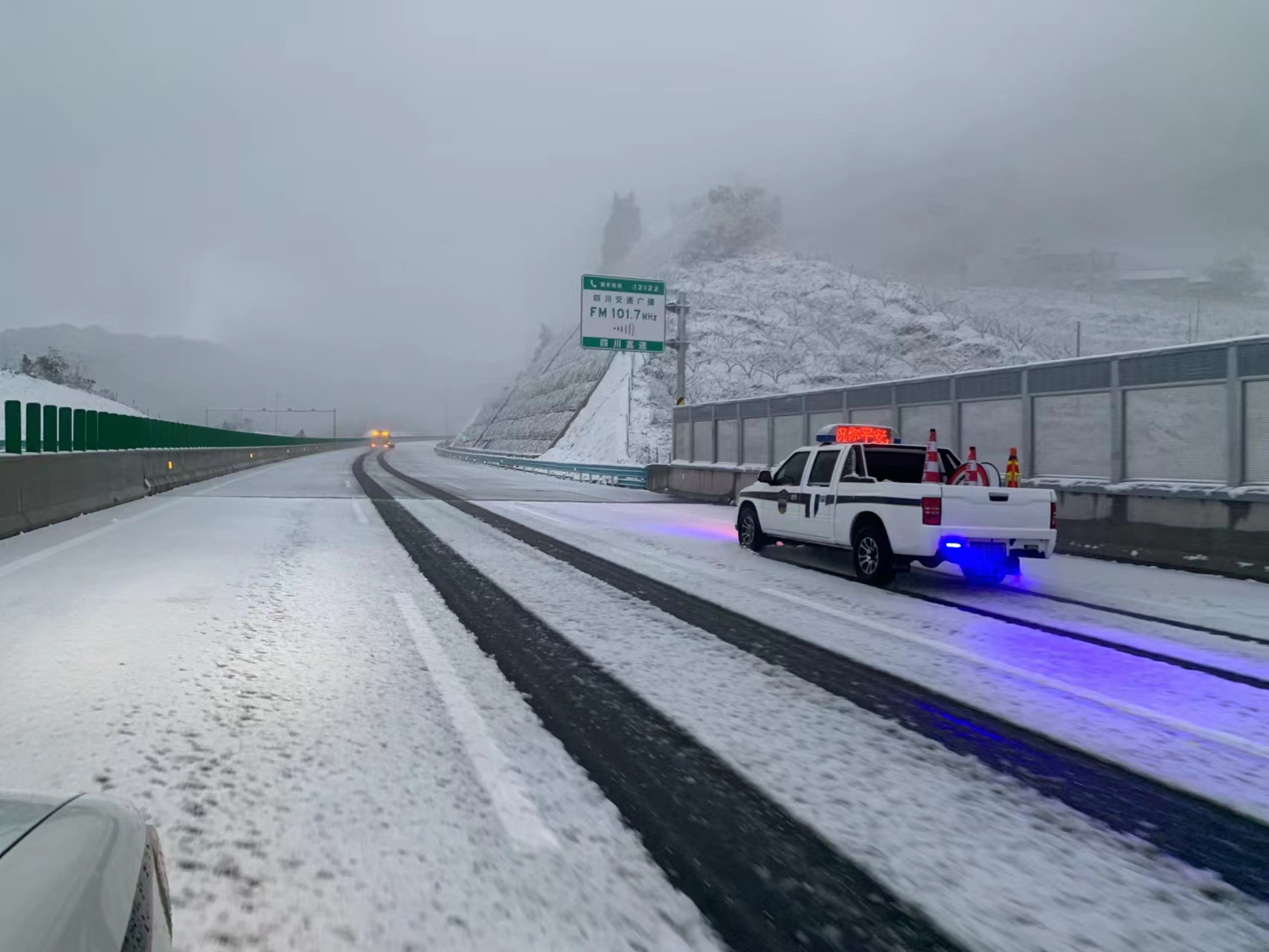 1月21日,川南地区迎来今年首场雨雪天气。多条高速公路出现积雪冰冻。四川高速公路公安局三分局各大队民警连夜迎战冰雪,确保高速公路交通安全畅通。