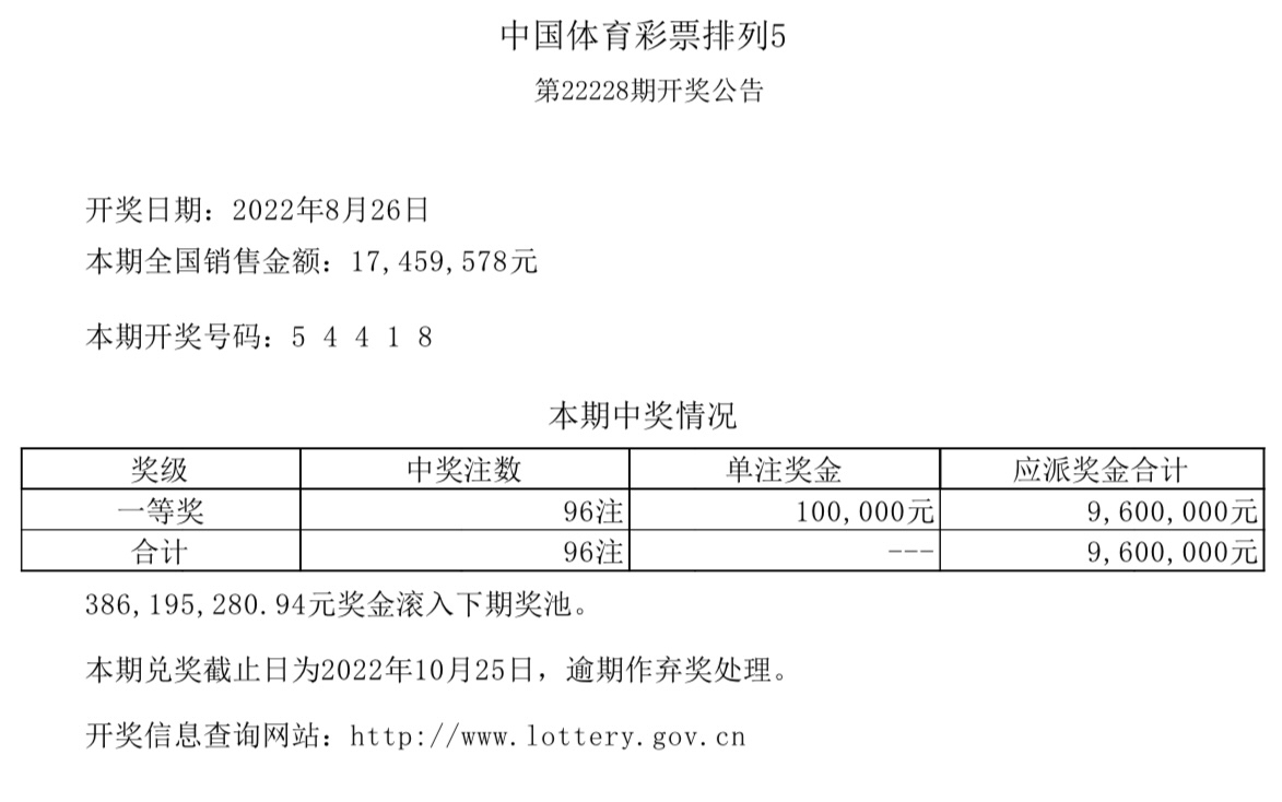 中国体育彩票排列5第22228期全国销售17459578元。开奖号码:5 4 4 1 8。