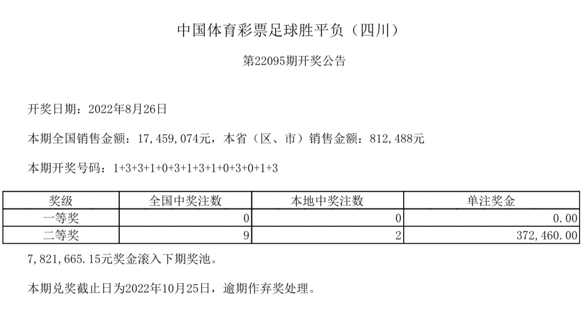中国体育彩票足球胜平负(四川)第22095期全国销售17459074元。开奖号码:1+3+3+1+0+3+1+3+1+0+3+0+1+3。