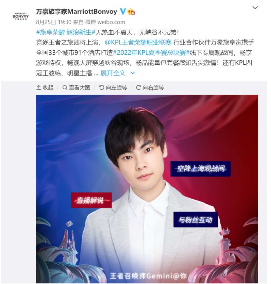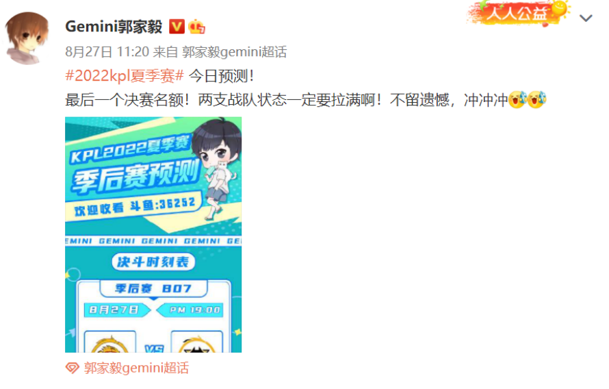 8月27日,2022 KPL夏季赛季后赛结束,连续进行了十天的季后赛,每个比赛日几乎都有多个赛事的相关话题登上微博热搜榜,8月24日,#Gemini#直播间的话题一度冲进微博热搜前十,而25日胜者组决赛暂停期间,也有很多观众用“Gemini等的都在玩XX游戏”了调侃等待时间的漫长。